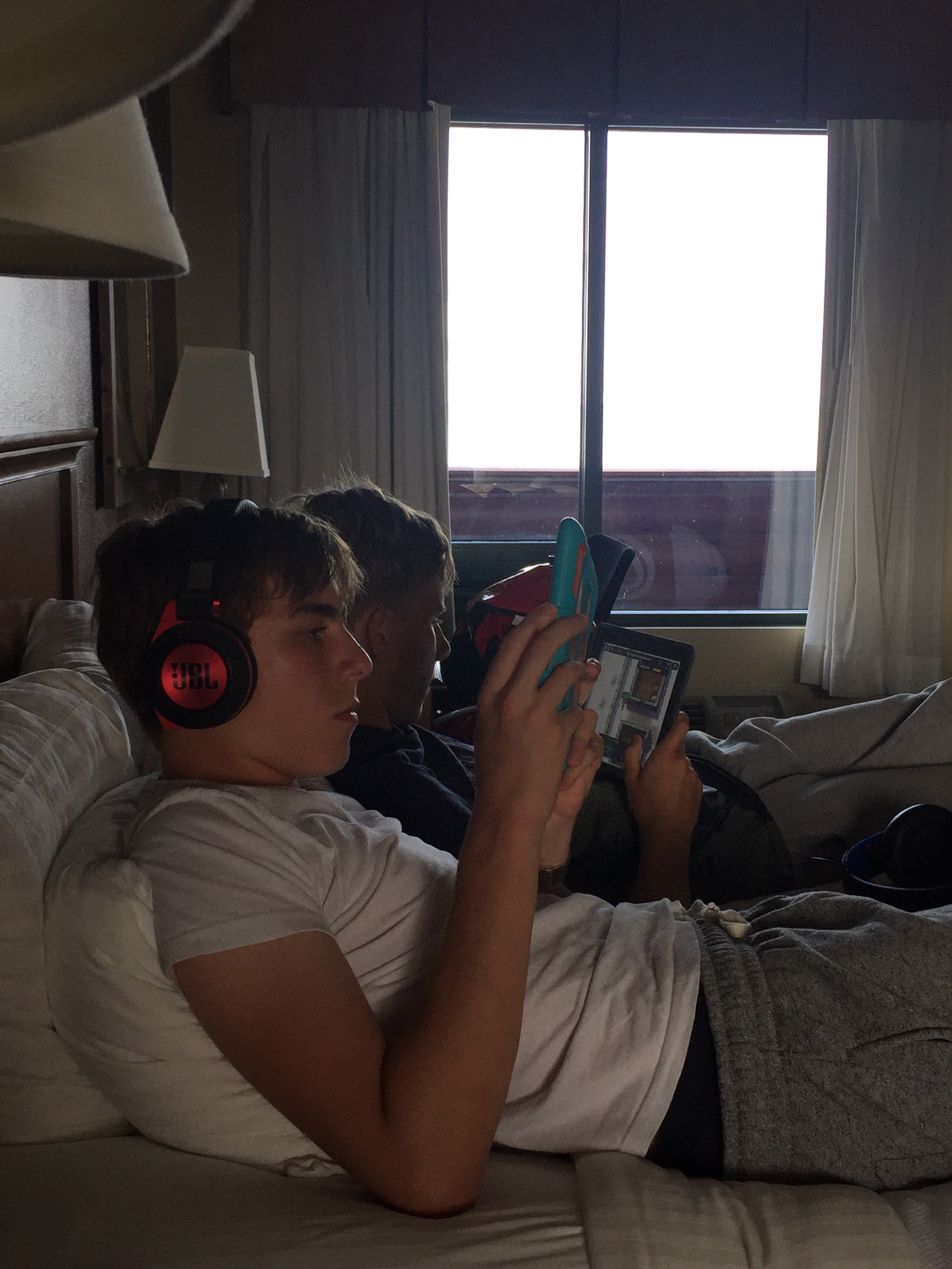 Thijmen haalt slaap in achterin. Jelmer speelt op de iPad.