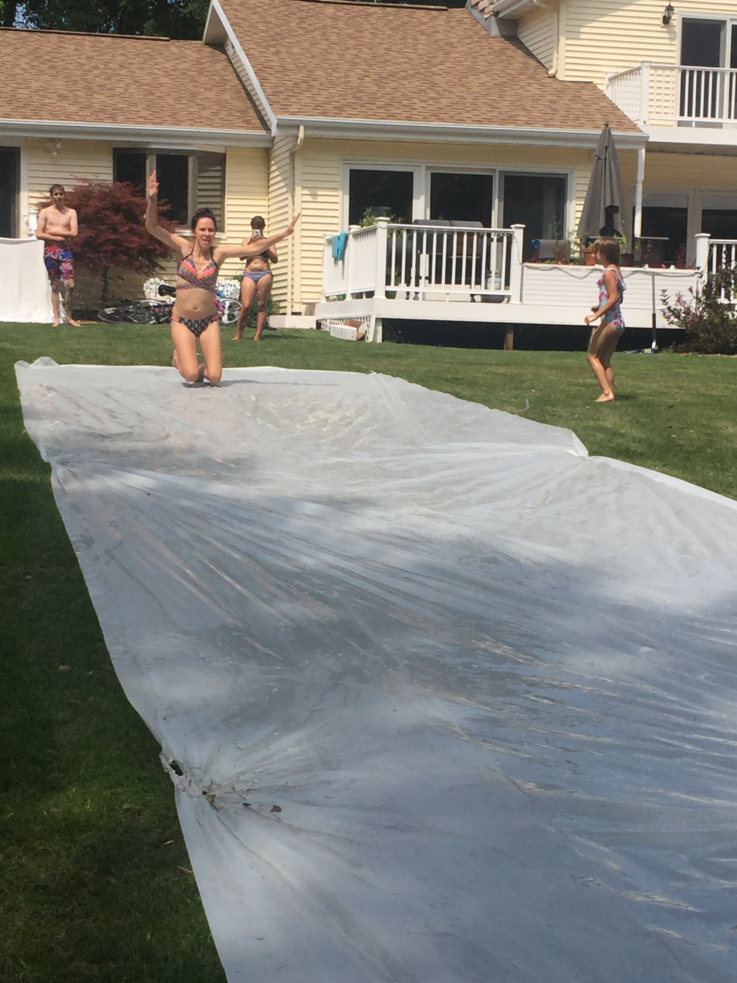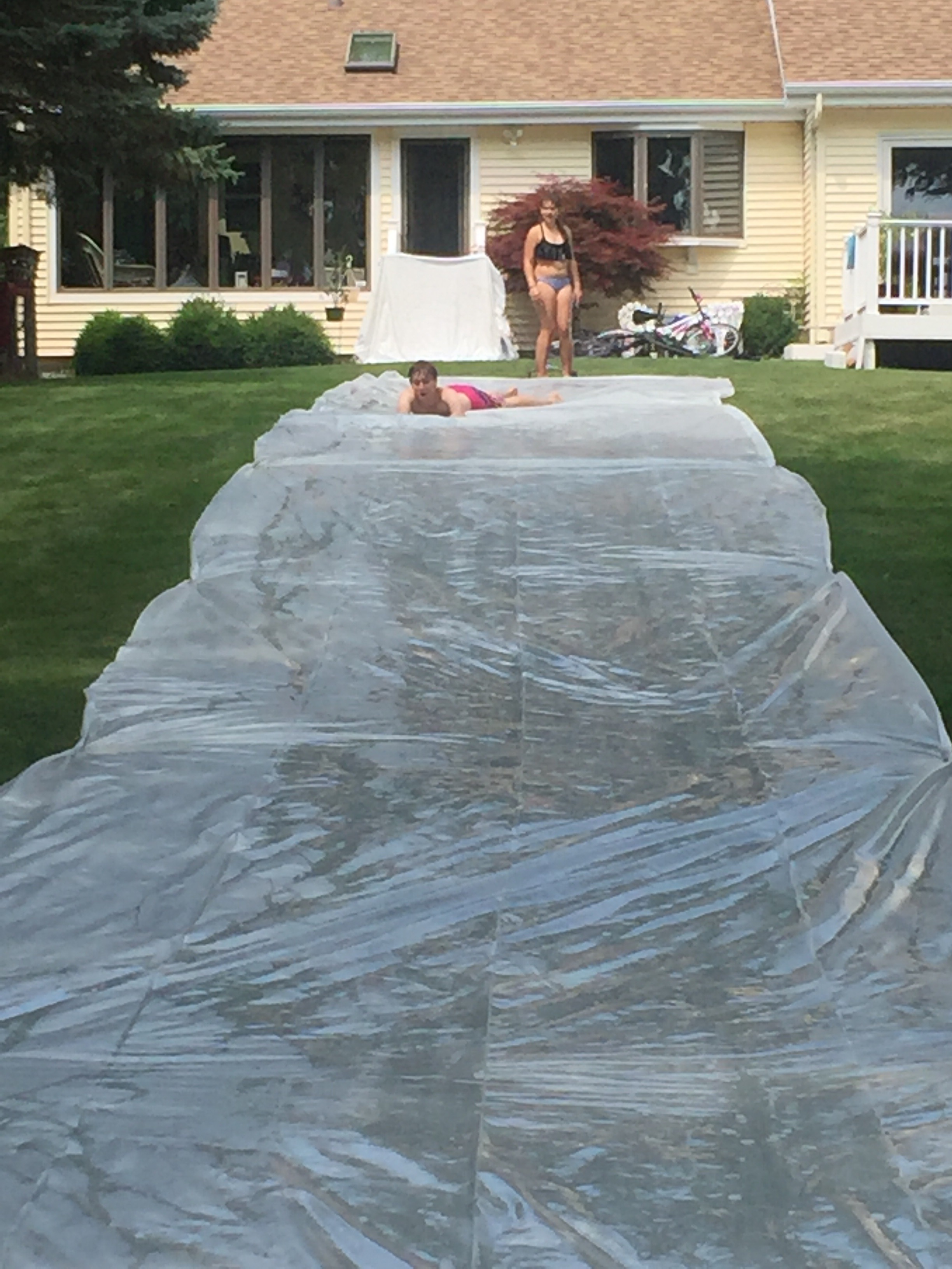 Jelmer en Nikki bedachten de waterslide. Wayne had enige bedenkingen over zijn gras. Ecologisch afbreekbare zeep, de oplossing was snel bedacht. Om 9 uur zaten ze op de fiets om de juiste zeep te halen.