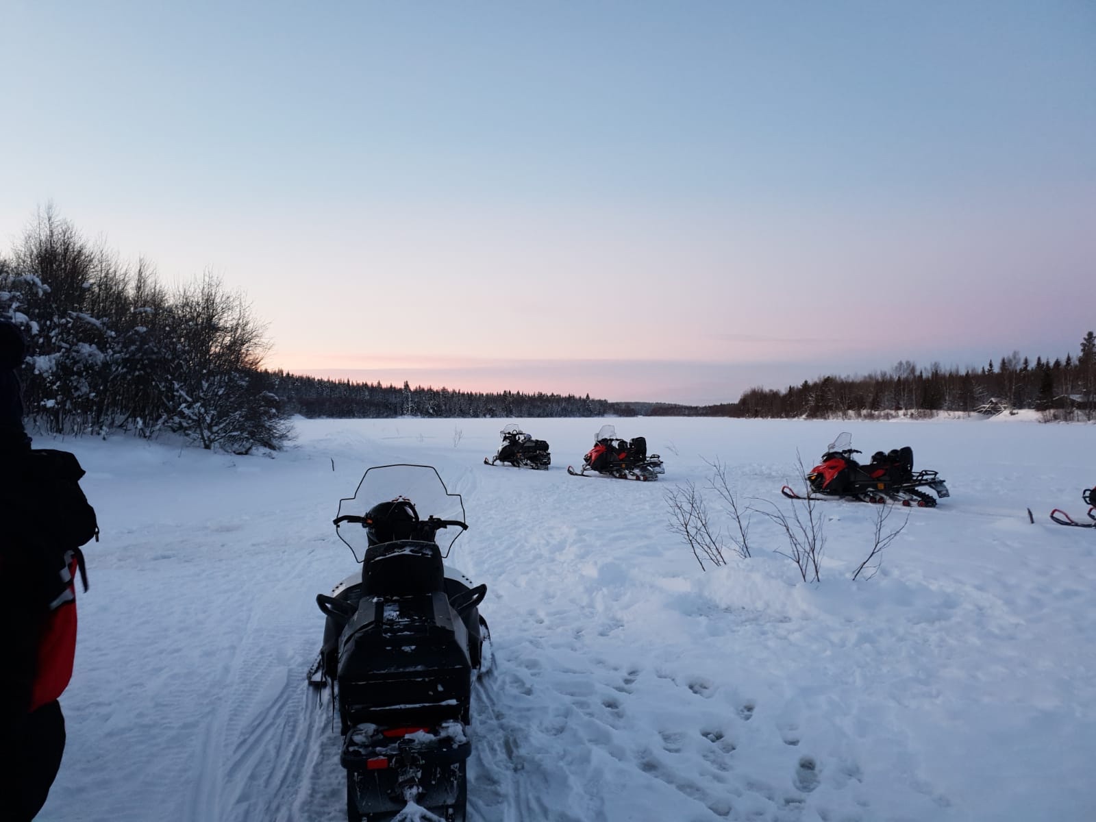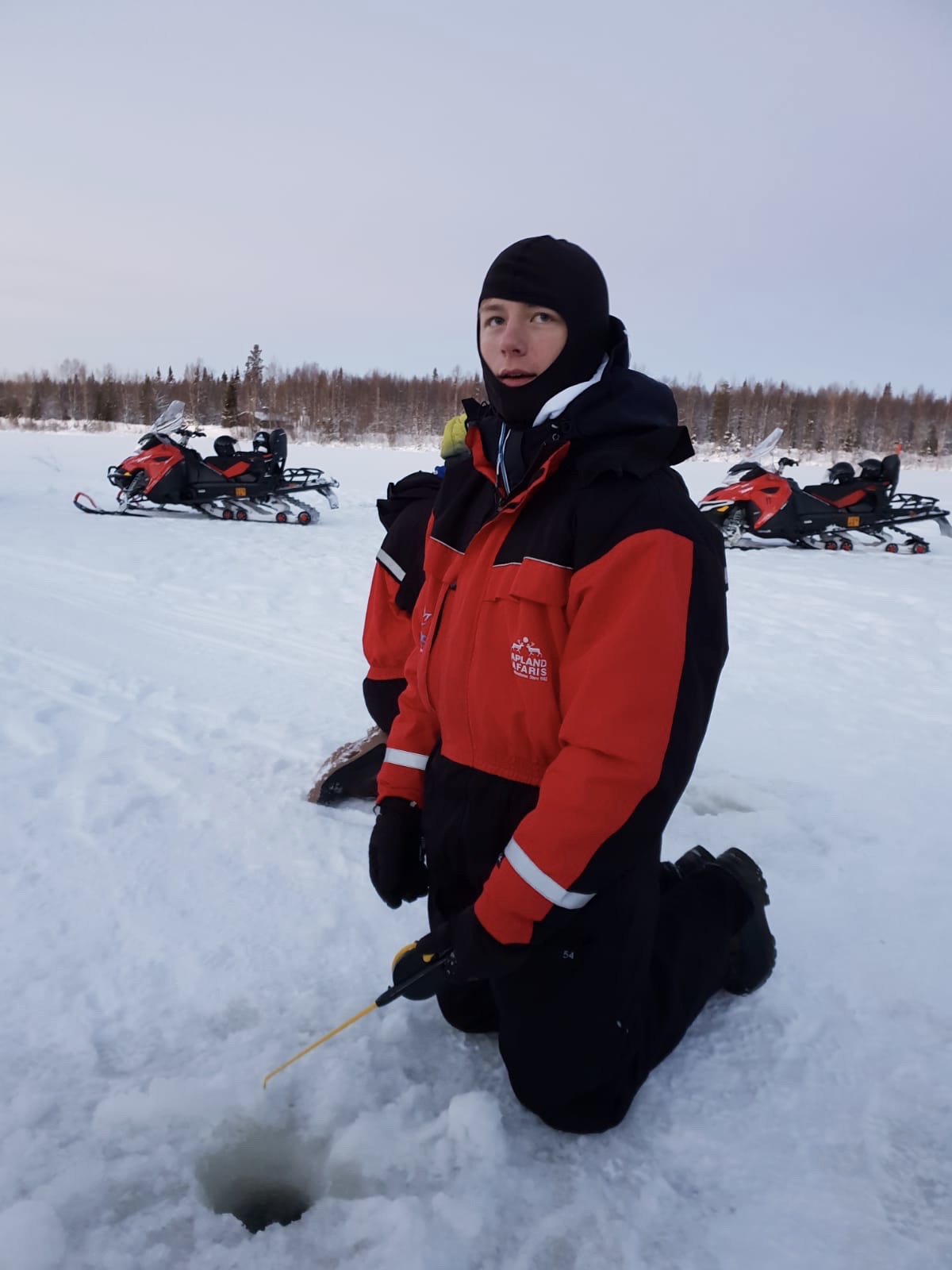 Vandaag gingen we met de sneeuwscooter naar een bevroren meer om te vissen. The road was bumpy. Dus de snelheid niet al te hoog. Zelfs zo laag dat Jolieke en Roelof stil stonden op een heuveltje. Best grappig, vonden wij.