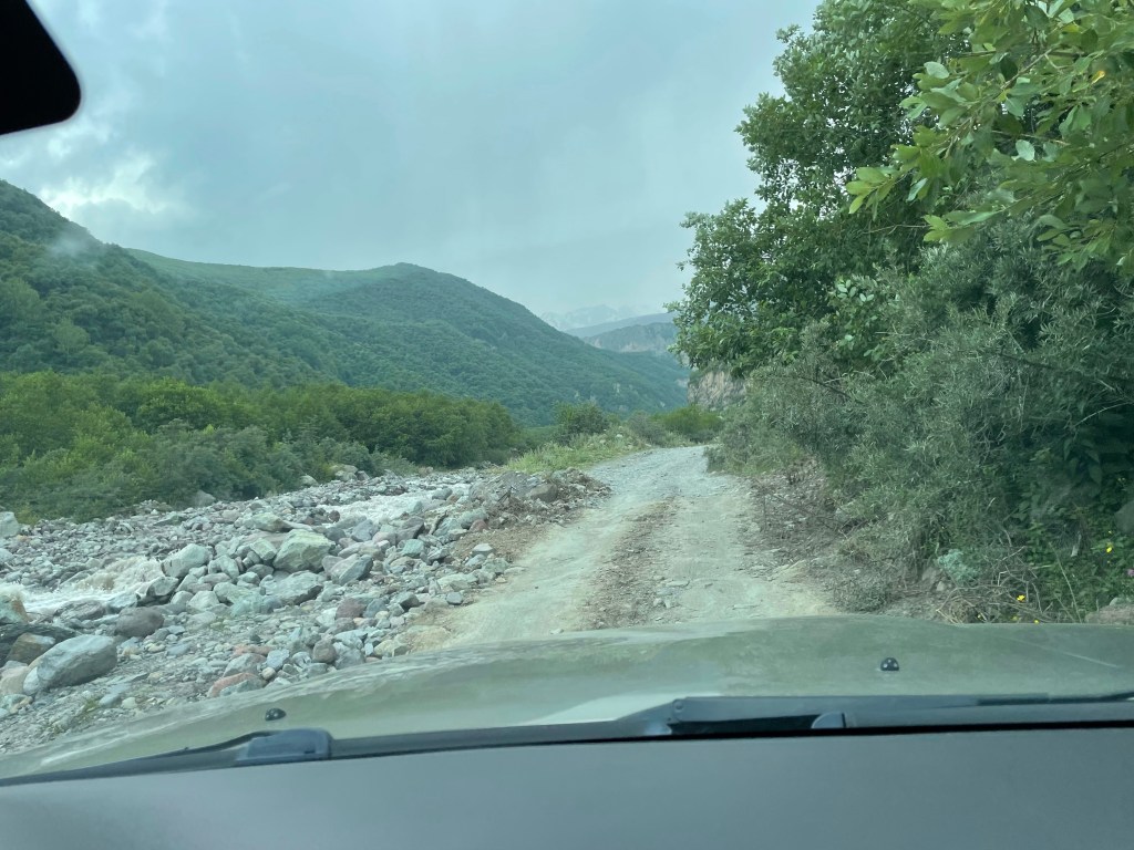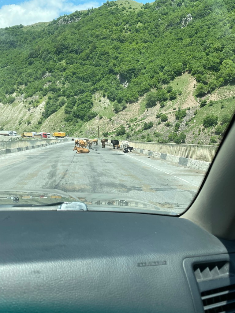 Een lange reisdag vandaag maar mooi opgedeeld in behapbare stukjes. We krijgen onze 4×4 en vertrekken om 10 uur uit Tblisi. Rijden nog een paar rondjes maar voor we het weten zijn we echt onderweg. Wat erg leuk is dat je de weg niet alleen hebt; koeien, varkens, ezels. Die laatste zowel in veterinaire als humane vorm. Kennen jullie de collectebus uit Harry Potter? De meeste Georgiërs denken dat hun auto dat ook kan. En ze hebben om-de-hoek-kijk ogen. Vooral handig voor diegenen die met hun stuur rechts rondrijden. (We hebben ontdekt hoe dat komt. Er waren te weinig auto’s en er werd van alles geïmporteerd. Logisch!)