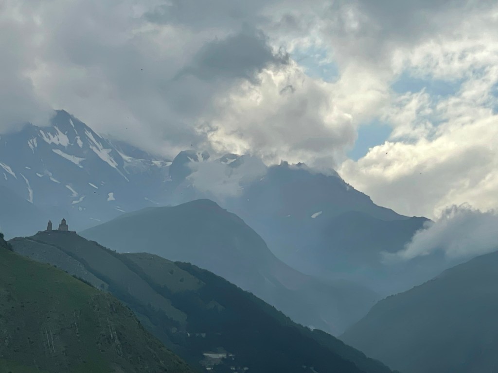En toen verder naar de Gergeti Trinity Church. Ik denk het meest beroemde plaatje van Georgië. De weg was verzakt en we moesten een dirtroad op. Beetje als de rivierbedding in Oman. En het ging top. Tot een rijder naar beneden doorreed en wij op weg naar boven moesten stoppen. Niet handig. De wielen sponnen, (later ontdekte Roelof een handig knopje om de traction control af te zetten) we konden niet voor of achteruit. Gewoon doorademen, auto in vrij rolde wel iets naar achteren. Verder naar rechts en nieuwe poging gelukt! Boven was de berg bijna vrij van wolken.