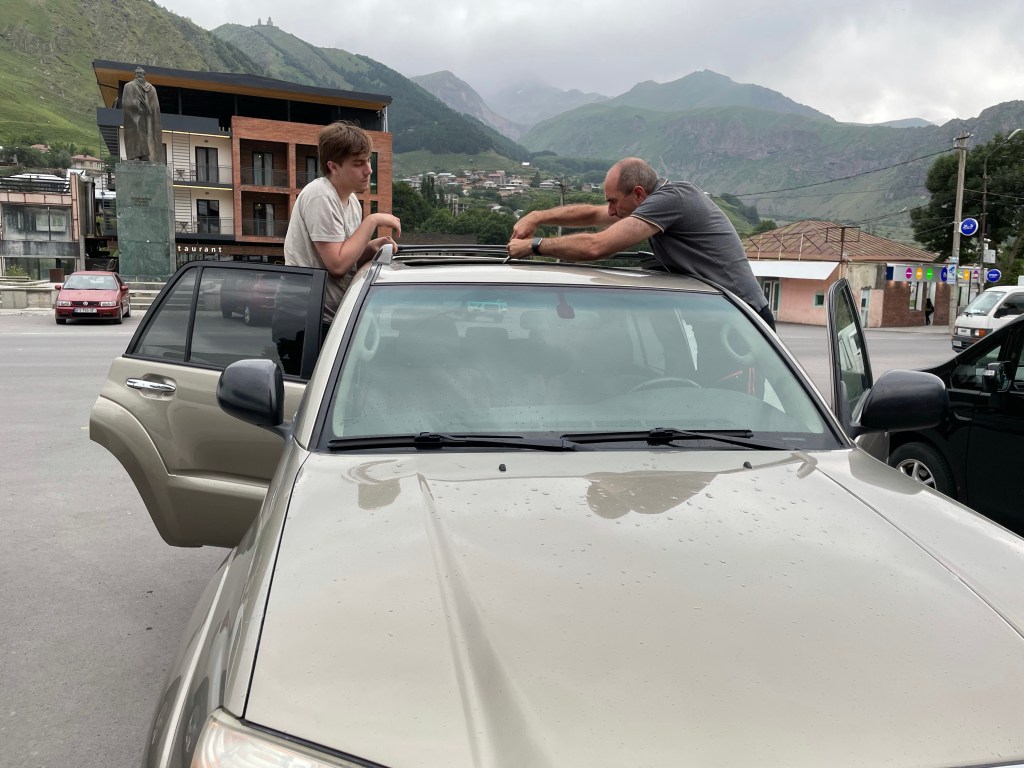 Over Roelof hebben de mannen besloten dat hij de handrem naar de filistijnen heeft geholpen. Nou had George over deze auto gezegd dat het een decent car was. Hij heeft wat butsen en plekken, maar het grootste probleem ontdekten we gisteren toen Jelmer opeens met zijn gordel in de hand zat, het ding bleek niet vast te zitten bij de zitting. Minor problem dat we tegenkwamen was het zonnedak dat inderdaad alleen voor zon is. Vanochtend kregen Roelof en ik al om en om een gutsje water, maar tijdens de bui vandaag ging het wel snel. We hebben de rubbers verbogen en aangestampt, de moer uit de middenstoel gebruikt voor Jelmers gordel en ach met die handrem zit het wel snor. It’s a bloody fine Toyota 4×4! (We verwijzen hierbij naar het programma Top Gear “killing a Toyota”)