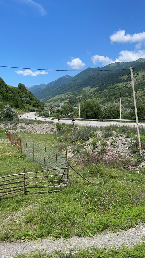 De rit naar Borjomi gaat eerst naar Tbilisi en dan door naar Gori. Het landschap gaat van bergen naar laagland. Het lage stuk lijkt armer. USSR-bouw. Als ik zeg dat ik al twee keer dacht dat iets een kippenhok was en er dan mensen blijken te wonen lachen de mannen me uit. Thijmen bedenkt een wedstrijd woonhuis versus kippenhok. Ook bruikbaar voor Ik-ben-geen-computer-test.