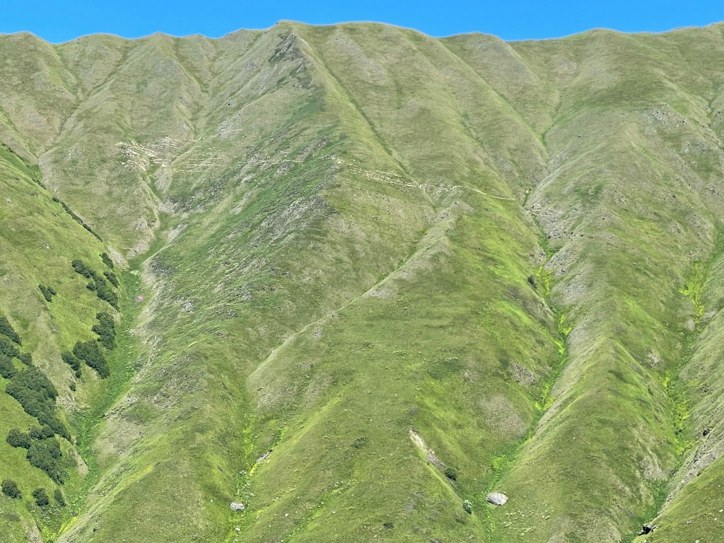 Als we teruglopen zien we witte draden over de berg, het blijkt een enorme schaapskudde. Naar beneden lopen gaat een stuk sneller dan naar boven.