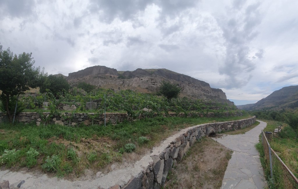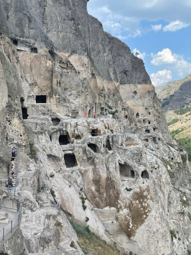 Ooit was deze stad in de bergen bedoeld als schuilplaats voor 50.000 mensen. Hij is gegraven in 50 jaar. Maar toen king Tamar aan het bewind kwam heerste er zoveel eenheid in het land dat zij er 700 monniken liet wonen. Helaas werd Vardzia daarna geteisterd door alles wat mogelijk was. Aardverschuivingen, de Perzen, de Ottomanen, de Turken. Hele stukken vielen eraf, al het kostbare werd geplunderd. En toch is het nog steeds indrukwekkend met kamers, lange tunnels en luchtschachten. Helaas niet op onze lengte zodat we al squattent door de gangen liepen. Thijm verwacht een goddelijk lijf. Ik kan er alleen op hopen.