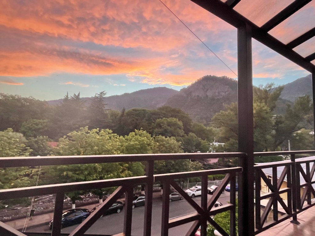 En nu zit ik op het balkon mijn blog te schrijven. Ik heb net mijn tweede koude douche genomen, best koel. Ik kijk naar een prachtige lucht. King Tamar is een vrouw trouwens, degenen die regeert heet king. Ook best cool; daar kan ik aan wennen.