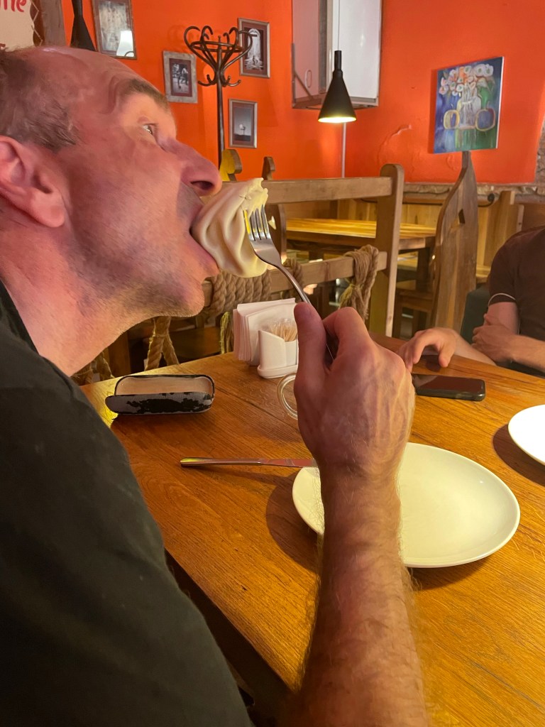 Net nog een keer bij “ons” restaurant de Georgische vorm van tortellini; Khinkali gegeten. Altijd lekker maar lastig eten. En een ijsje toe. Heerlijk; wel een tip neem een bakje en geen hoorntje bij 100 *F, hoorntjes leveren een erg plakkerig mens op. Wij kunnen dat weten.