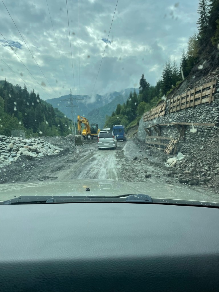 We zitten in het hoogste continue bewoonde dorp van Europa. De weg er naar toe was een pittig weggetje. Halverwege een bord dat er gewerkt werd van 8-12 en van 14-18 uur, “u kunt in die tijden niet door, sorry voor het ongemak.” We reden de ruime eenbaansweg (voor twee rijstroken, maar gewoon verder. En het klopt ze zijn aan het werk.