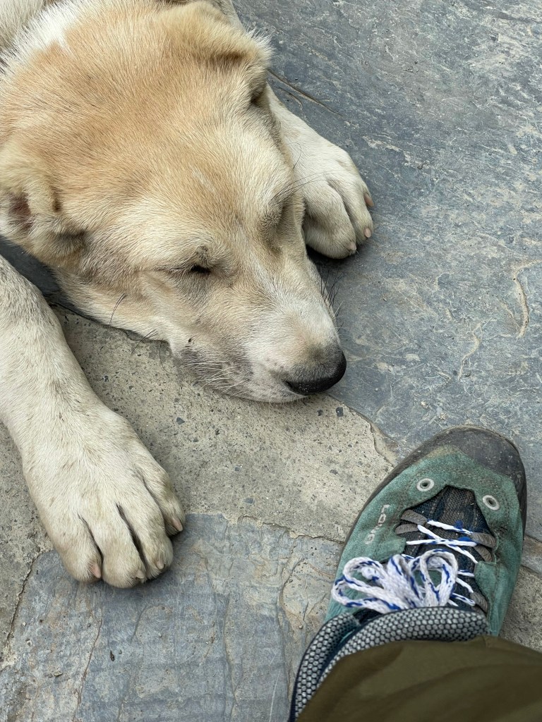 En nu zitten we in hotel Panorama Ushguli. Het klopt; we kijken uit op de Shkhara gletsjer. Maar eerlijk is eerlijk ik geniet meer van een drie maanden oude pup met de grootste poten die ik ooit gezien heb, die aan mijn voeten ligt. Hij is 3/4 van Louis, nu al. Dit wordt een reus.