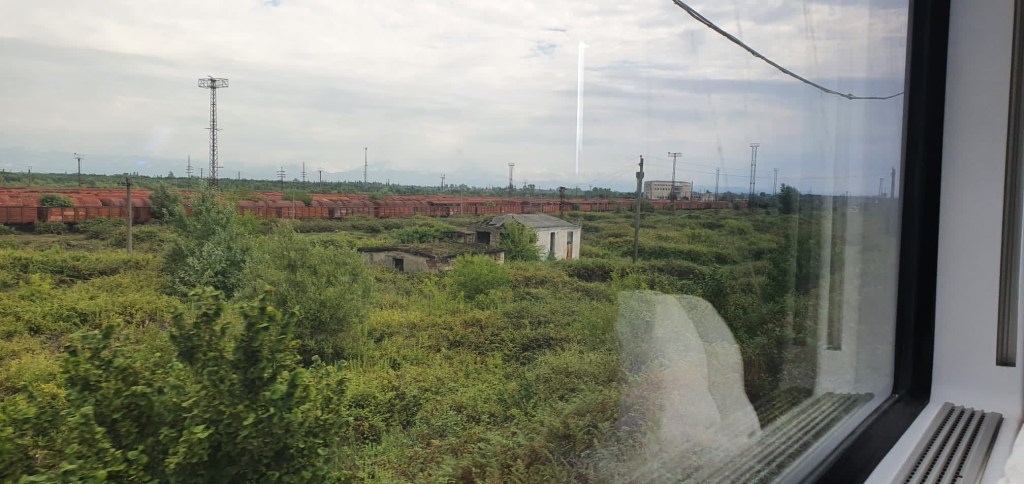 Trein naar Tbilisi. Prima geregeld, gehaald, maar wat een lange rit. We hadden gisteren broodjes gehaald. Verschillen smaken waaronder helaas weer een bonenbroodje, klein foutje. Roelof laat hem vallen, gruwelijk wat een zooi, per ongeluk?.
