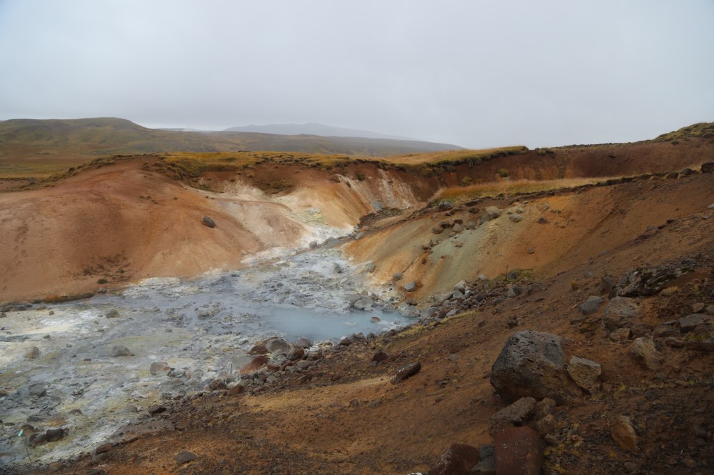 We beginnen met Krysuvik een geothermisch gebied. Door Roelof wordt dit steevast geothermisch bad of pool genoemd. Hij heeft dan ook als enige een zwembroek meegenomen. In mijn hoofd wordt het steeds groter en loopt hij op die plankiertjes met snorkel, duikbril en badhanddoek. Voorstellen hoe andere toeristen dan zouden kijken maakt het heel erg leuk. Het water kookt en bubbelt. Het beeld is prachtig. Helaas was een zwembroek slimmer geweest want we regenen heel nat als we ons te laat realiseren dat de overgang in dit land van droog naar regen nogal abrupt is.