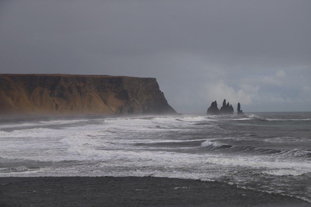 Eerste stop Reynisfjara; rotsen in zee, volgens de verhalen trollen in zee die door het zonlicht overvallen waren. Een prachtige klif met uitzichtpunt. En de steeds aanwezige bui als we op het verste punt zijn.