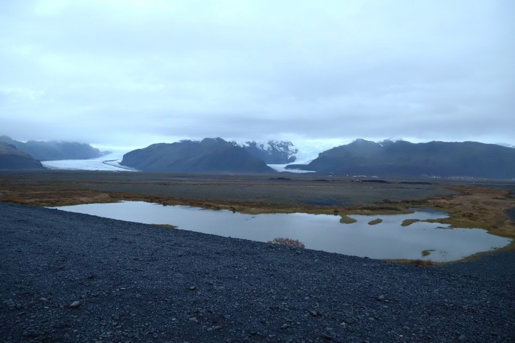 We komen uit bij een gletsjer Vatnajökull. We staan op een parkeerplaats en zien twee tongen naar beneden komen. Het is bizar groot. Adembenemend mooi. De volgende dag komen we er achter dat hij 8300km2 is en dat we een uur lang langs de gletsjer rijden maar dat zien we niet met de mist en later in het donker. De grootste gletsjer op aarde, gemiddelde dikte 400 meter, maar op sommige plekken tot 900 meter dik.