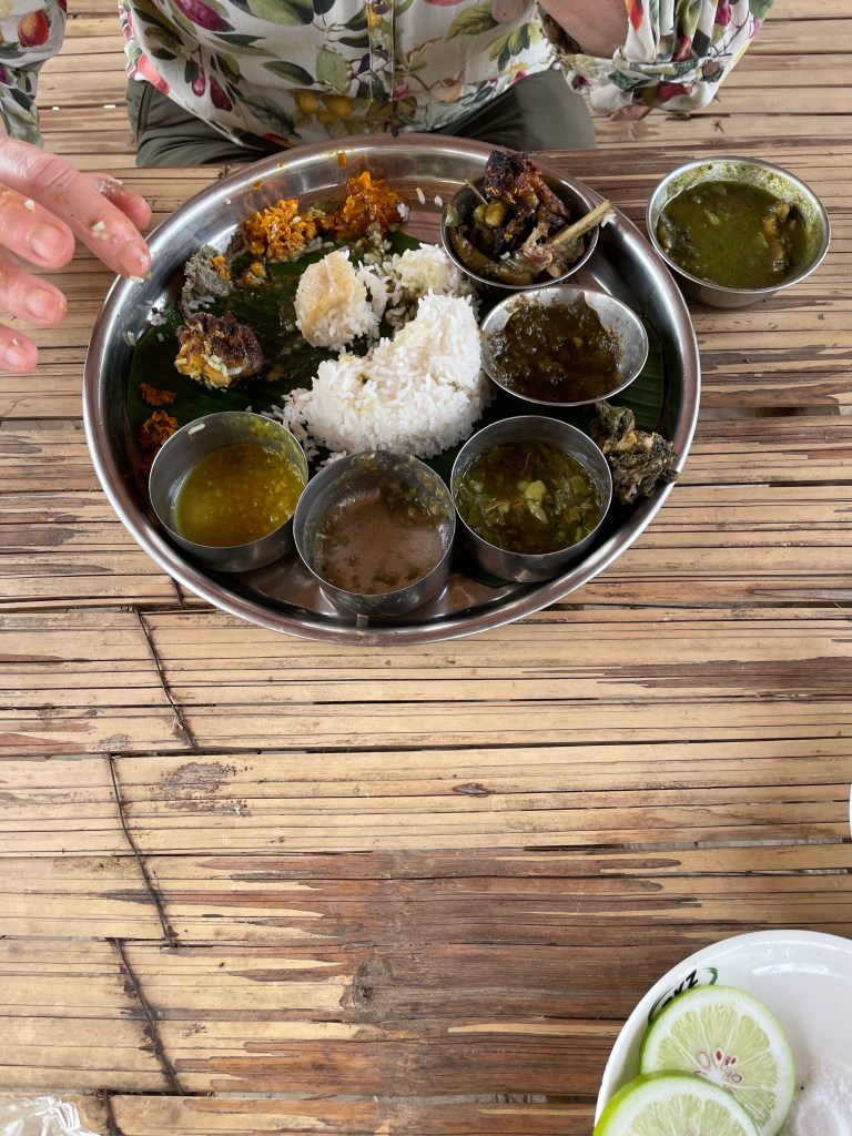 We lunchen in een restaurant dat is opgezet om de lokale bevolking te steunen, zodat zij het park gaan steunen. Goede zaak, lekker eten. Helaas ligt Assam dichter naar China, ook hier slaan ze de kip met een scherp mes in stukken in plaats van gefileerde stukjes.