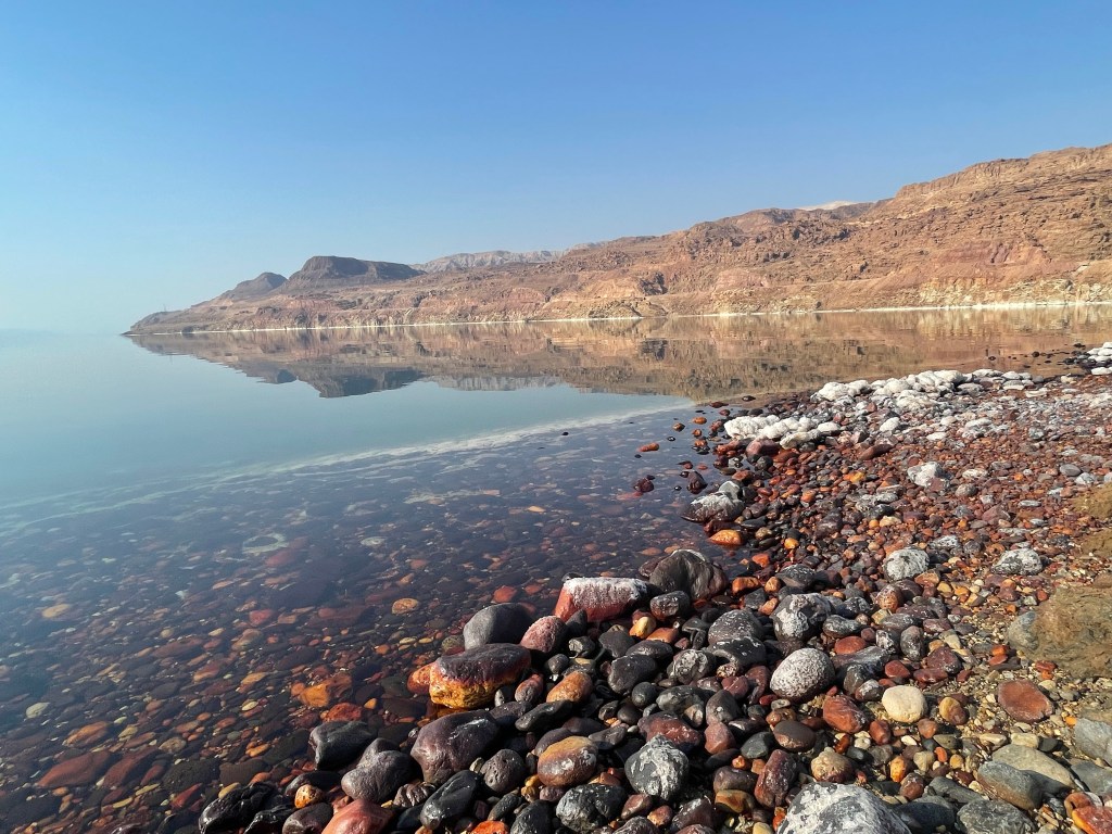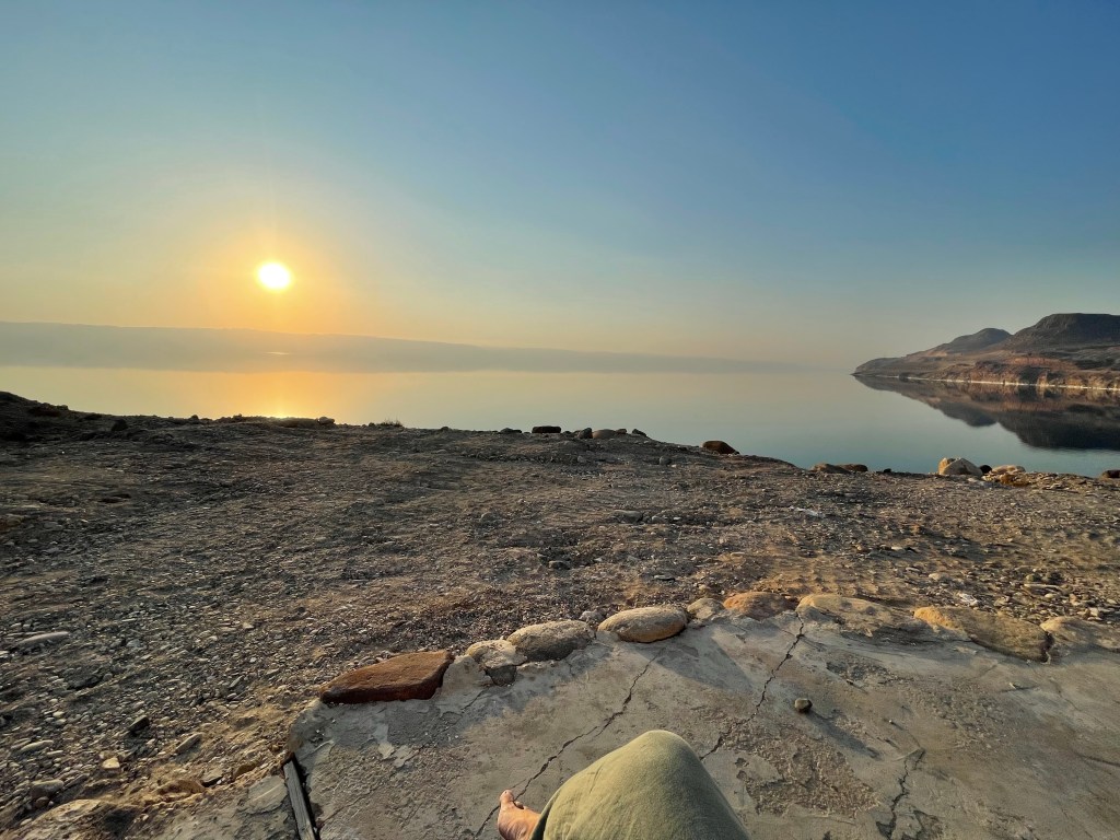 We komen aan bij de dode zee. Het is bloedheet, vochtig, en de overkant is in nevelen gehuld. Omdat er weinig toeristen zijn is er geen lunch mogelijk. Onze kamer is de laatste cabin van een rij, met airco en dat is oprecht geen overbodige luxe. De 5 minuten wandeling naar de kamer is best pittig. Gelukkig hebben we nog Granolarepen en vrij zachte Toblerone bij ons.