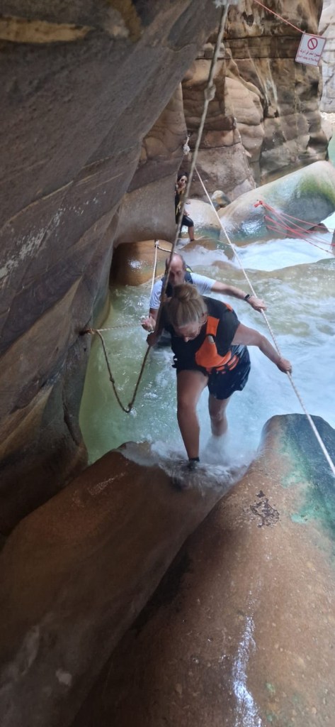 Vanochtend om 8 uur ontbijt, het kon niet eerder. Om 8.25 waren we onderweg, we hadden om 8 uur bij de siq trail in de wadi mujib willen zijn. Gelukkig kwamen we binnen voor een paar bussen. Helaas wisten we niet dat we onze naam op een lijst moesten zetten. Was leuk geweest als iemand dat verteld had, dus eigenlijk stonden we toen weer achteraan. En het was best spannend of er genoeg zwemvesten zouden zijn. Als ze op zijn moet je wachten tot de eerste mensen terugkomen. En dat kan 2-3 uur duren.