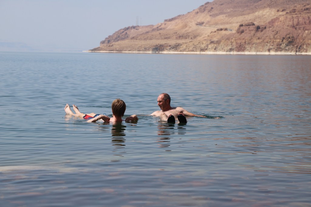 Thijmen is blij verrast dat hij eindelijk kan drijven. Ik heb daar nooit last mee, ik heb voldoende volume voor elk soort water zullen we maar zeggen. Zolang je het water niet in je ogen krijgt is het eigenlijk heel lekker. Beetje olieachtig. Raar dat je veel verder boven het water uitsteekt en beweegt met trage bewegingen. (Ook om spetters in je ogen te voorkomen) Denk dat niet scheren vanochtend een goed plan was van ons allemaal. Als je kijkt in het water zie je dat het enorm verzadigd is, kleine golfjes. Thijmen zoekt het op haliene stromingen. Niet dat iemand dan weet wat ik bedoel. Zo ontstellend zout is het. (Ik weet het nu hoe je het kan zien, als je veel te veel suiker in een glas thee doet en dan een slag roert.)