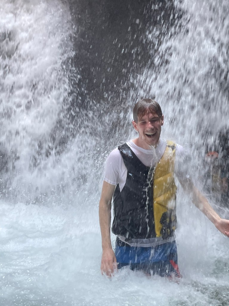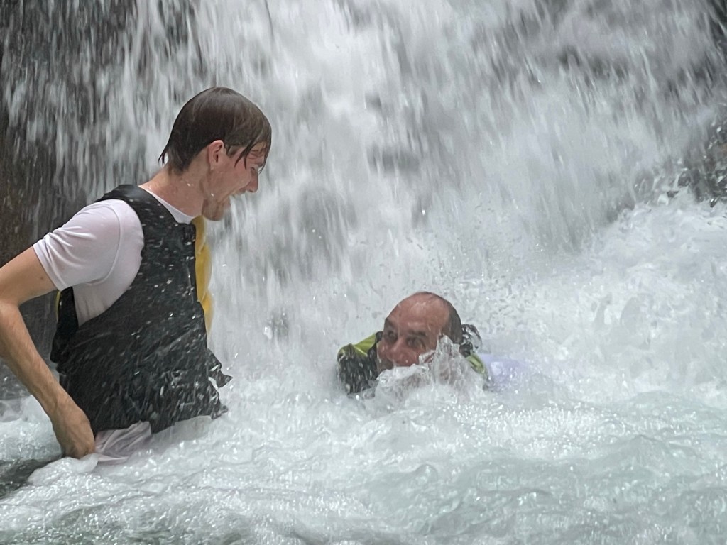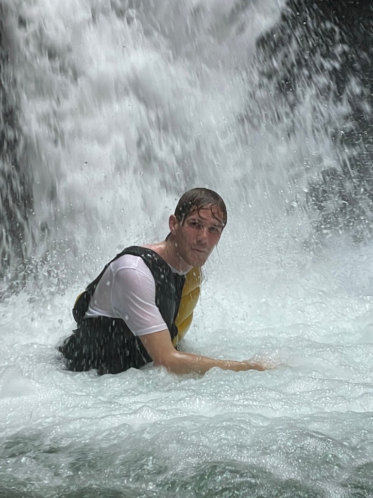 Helemaal aan het eind van de trail is een waterval. Je kan erachter. Thijmen loopt er door om een briljante opname te krijgen. Dat valt als effect wat tegen vindt hij. Daarna dezelfde weg terug wat grotendeels neerkomt op mee dobberen met de stroom en af en toe een spectaculair glijbaantje of klimmetje. Wat onwijs mooi!