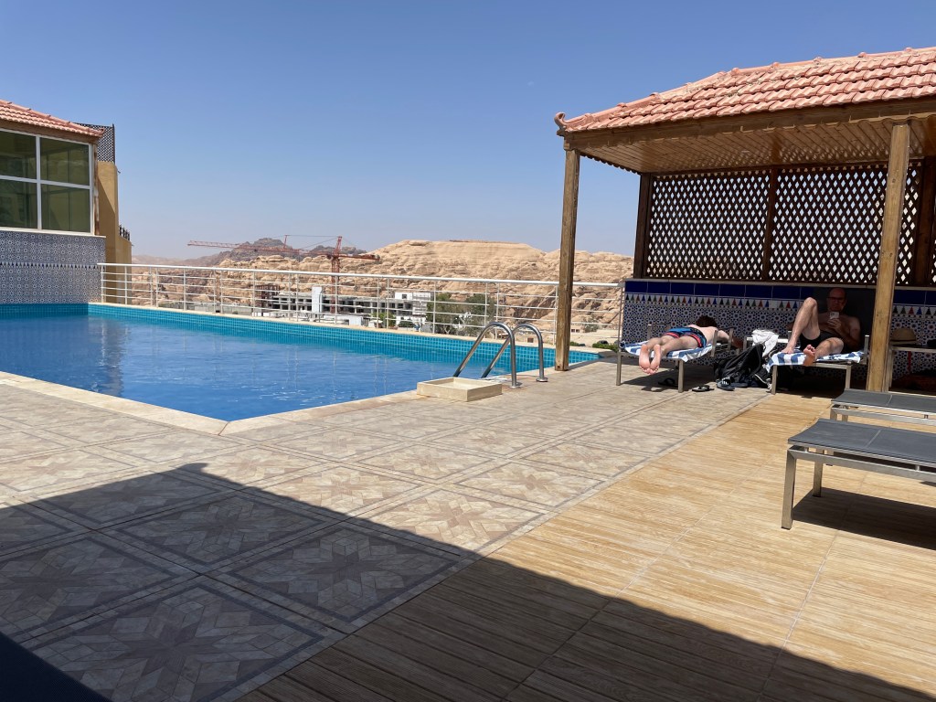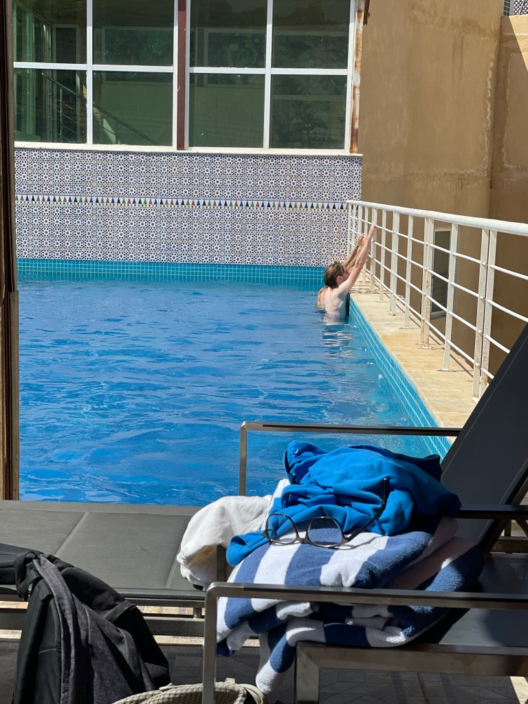 We besluiten voor 9 uur terug te zijn zodat we rustig kunnen ontbijten en lekker even het zwembad voor ons alleen te hebben. We hebben al 9.500 stappen gedaan.