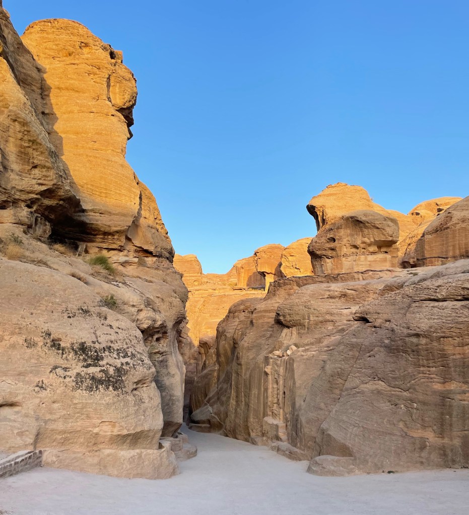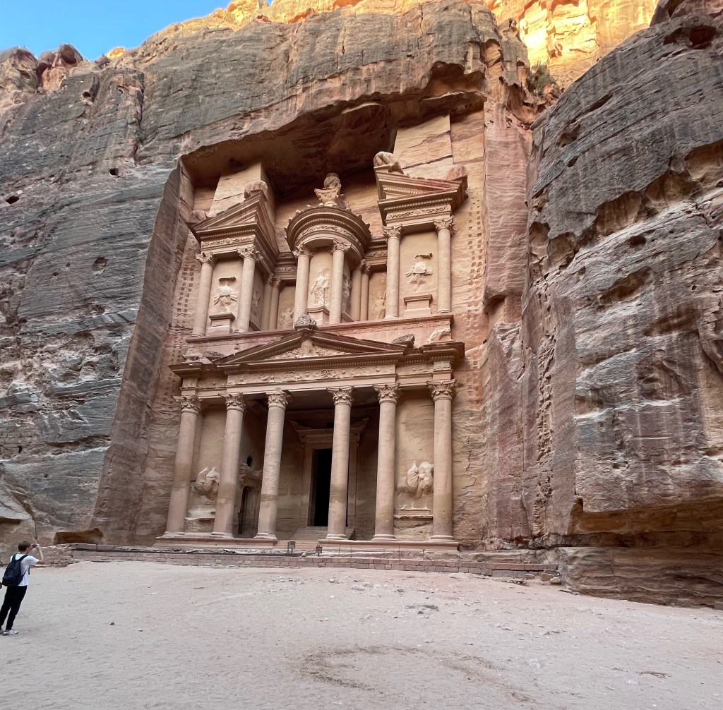 Ons hotel is tegenover het visitors center 250 m lopen. Wandelen naar de Siq 750m. Door de Siq 1,2km. Als we vlak bij de Siq zijn en ik wil een foto maken zit er geen batterij in mijn toestel en de reserve ligt thuis. Ik sommeer Roelof zijn camera te pakken, maar die zit in de gapbag, in het hotel. De sfeer daalt wel een beetje. We besluiten mopperig om toch naar de schatkamer te lopen. We hebben natuurlijk onze telefoon.