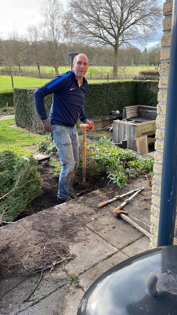 Tijdens dit soort verbouwingen valt me altijd op hoe ontzettend sterk Roelof is en hoe hij denkt dat dat normaal is. Misschien dat Daan een steen van 80 kg op zijn plaats zet of Koen maar verder houdt het denk ik wel op als ik in mijn vriendenkring ronddenk. Maar in ieder geval paste hij de zitkuil aan met een nieuwe hoek zodat het terras aan de voorzijde ruim genoeg kan worden en we de zitkuil houden.