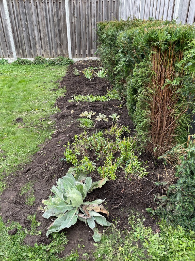 Om het nieuwe terras aan de voorkant vorm te geven moet een heg er tijdelijk uit, een deel van de zitkuil moet veranderd worden en een deel van de border wordt geofferd. En omdat er een steiger om het hele huis komt te staan leek het me handig als de bouwvakkers gewoon door de rest van de borders konden lopen zonder mijn planten te vernielen, dus er was wel wat werk te doen.