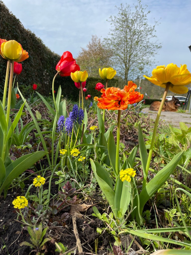 Nienke en ik sleepten allerlei planten uit de tuin naar de achtertuin. Roelof haalde een heg weg en we hopen dat alles overleeft, gelukkig regende het hard de eerste weken na onze verplaatsing. Tot mijn stomme verbazing staan de borders weer vol, we blijken nog zo’n 100 uienbollen gepland te hebben afgelopen jaar. Even vergeten. Maar gezien het steeds verder opschuiven van de begindatum is dat misschien maar beter ook.