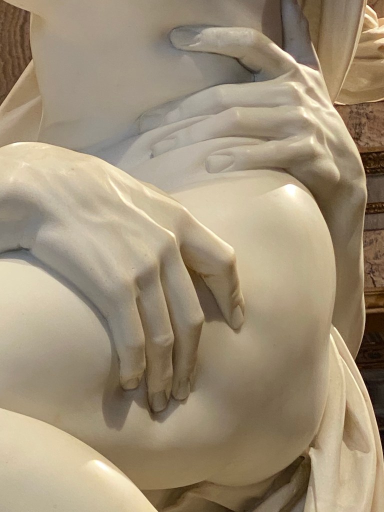 En daarna fietsen we via het park naar de villa Borghese. We zijn te vroeg, liggen in het gras en kijken naar pubers die elkaar helemaal nat gooien met water uit de fontein. Binnen heel veel werk van Bernini en Caravaggio. En een geweldige gids, mocht je ooit naar Rome gaan vraag hem. Hij vertelde verhalen, genoot van zichtbaar van zijn werk en het leven van Bernini en Caravaggio bloeide voor onze ogen op. Door hem had ik bijna spijt (bijna hè)dat we niet naar de Spaanse trap gingen want daar stond een werk van Pietro Bernini. De vader van de wereldberoemde Bernini. Grapje van Nienke “mooi als je beeldhouwer bent en je naam is Pietro (rots)”