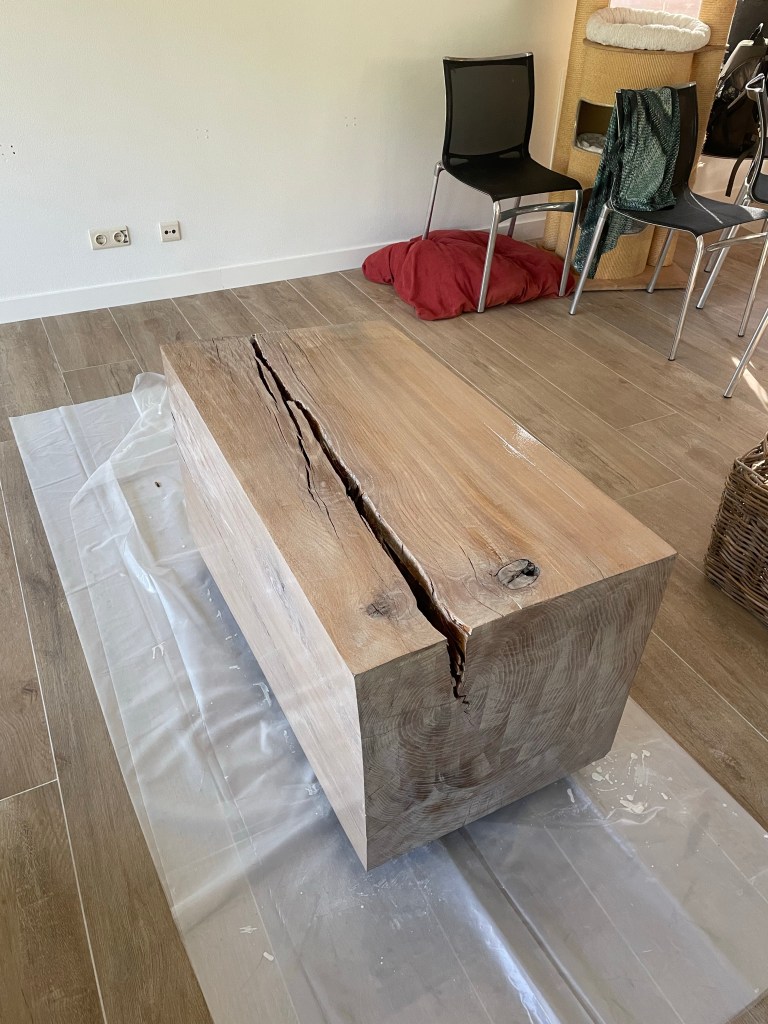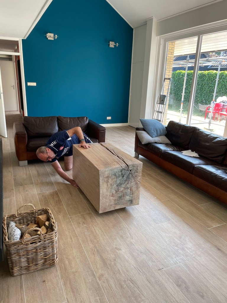 We doen een laag witte olie op het blok. Schuren het weer licht af en doen er een laag gewone olie over. Ik vind het mooi. De eettafel idem. Het past prachtig bij de vloer. Ik loop te glimmen. De jongens (die al lang mannen zijn) moeten er even aan wennen.
