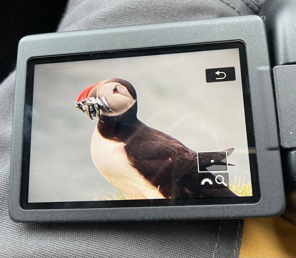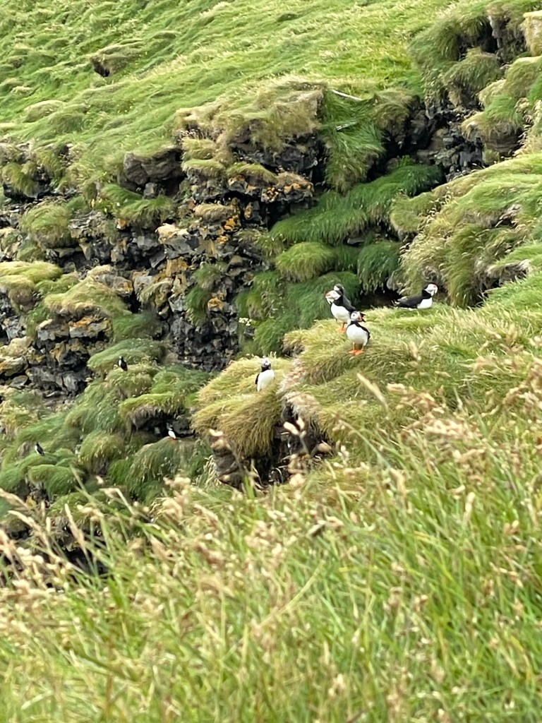 Roelof raakt helemaal bevlogen door het fotograferen van papegaaiduikers in de vlucht. Heel moeilijk omdat ze 90 km per uur vliegen. Eerst moeten we hem verjagen omdat hij midden tussen de nesten gaat zitten. Eerlijkheid gebied te zeggen, het ziet er ook uit als een konijnenhol en we hadden niet verwacht dat ze zo hoog nog zaten. Vervolgens gaat hij op een rand van het pad zitten. Jelmer vraagt hem om de camera naar ons te gooien mocht hij vallen: “zo’n puffin staat altijd goed op de kaart”.