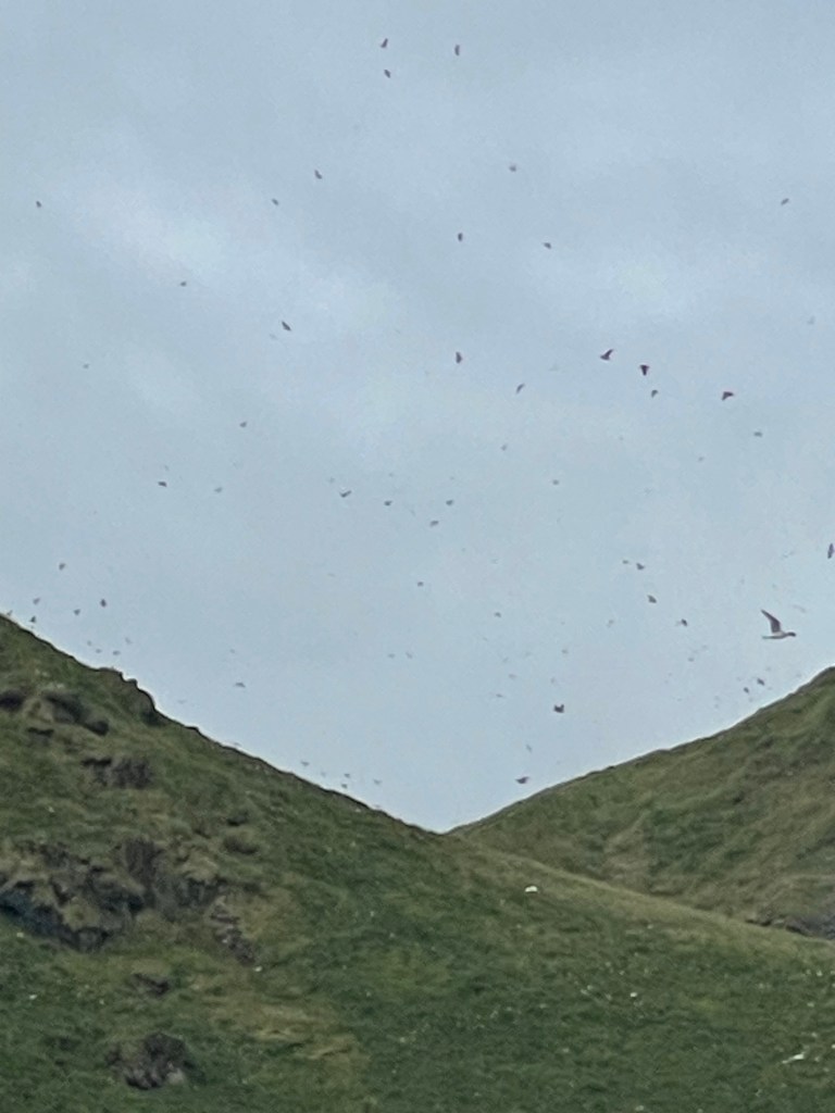 Het is net als naar Vlieland gaan. Ik herinner me mijn angst vroeger om die zware toiletdeuren op slot te doen. En buiten hoop ik op een zware shag rokende schipper bovenwinds. Niets vind ik zo lekker ruiken als zilte zeelucht vermengd met de rook van zware shag. Grappig hoe sommige herinneringen zo weer het gevoel van toen oproepen. Als we de eilanden bereiken komen we langs een stuk waar hele vluchten papegaaiduikers omheen zwermen. Koddige beesten. Dat plompe lijfje die kleine vleugels die met moordend tempo op en neer gaan.