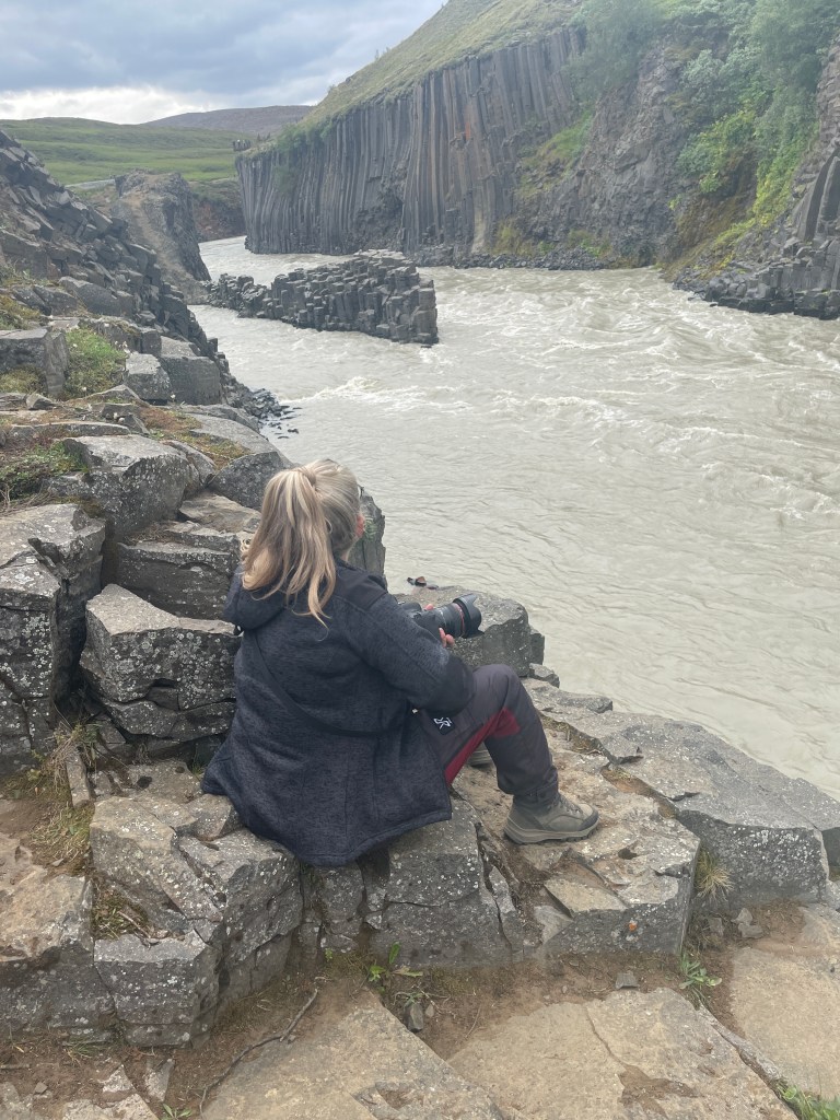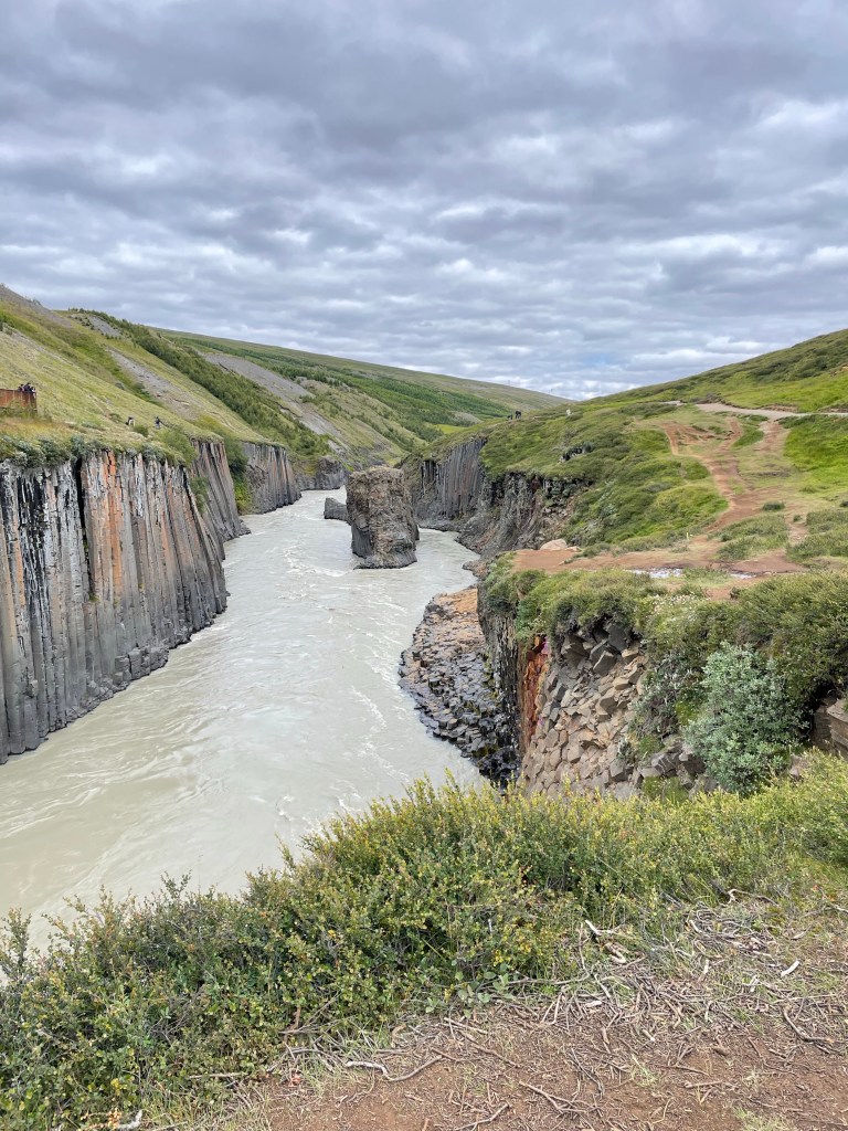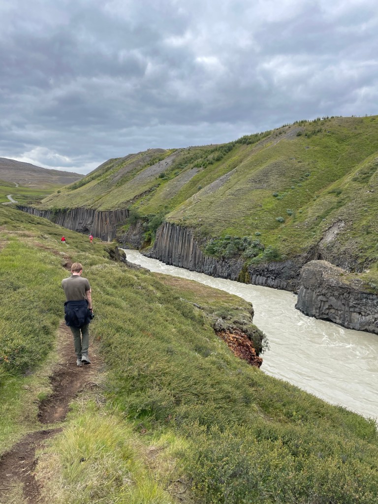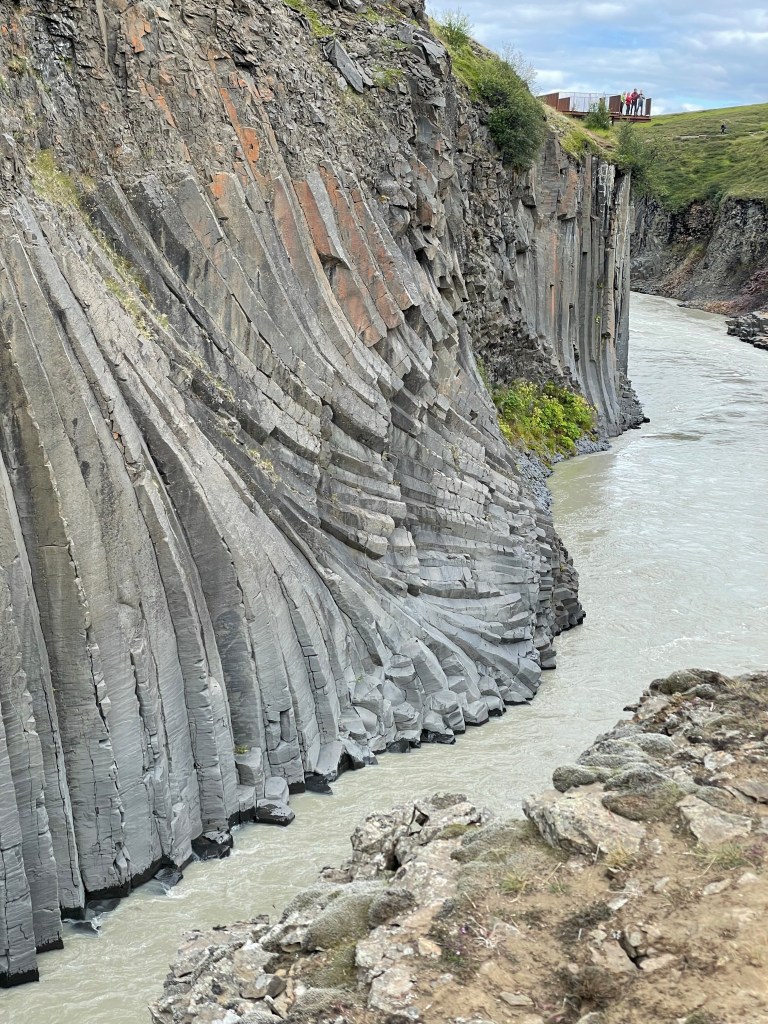 Na op tijd op te zijn gestaan, gaan we naar de basaltkolommen die door instagram populair werden. We volgen de aanwijzingen; parkeren bij de brug en wandelen naar beneden. Allerlei auto’s rijden ons voorbij, de een na de ander, na 2 kilometer blijkt er nog een parkeerplaats. Je kunt dus 6 ipv 10 km lopen. Ja Thijmen jij had gelijk, jij had dat al gezegd! Daarna loopt iedereen, dat voelt eerlijker. Het is inderdaad prachtig. Enorme basaltkolommen en grijsgroen water.