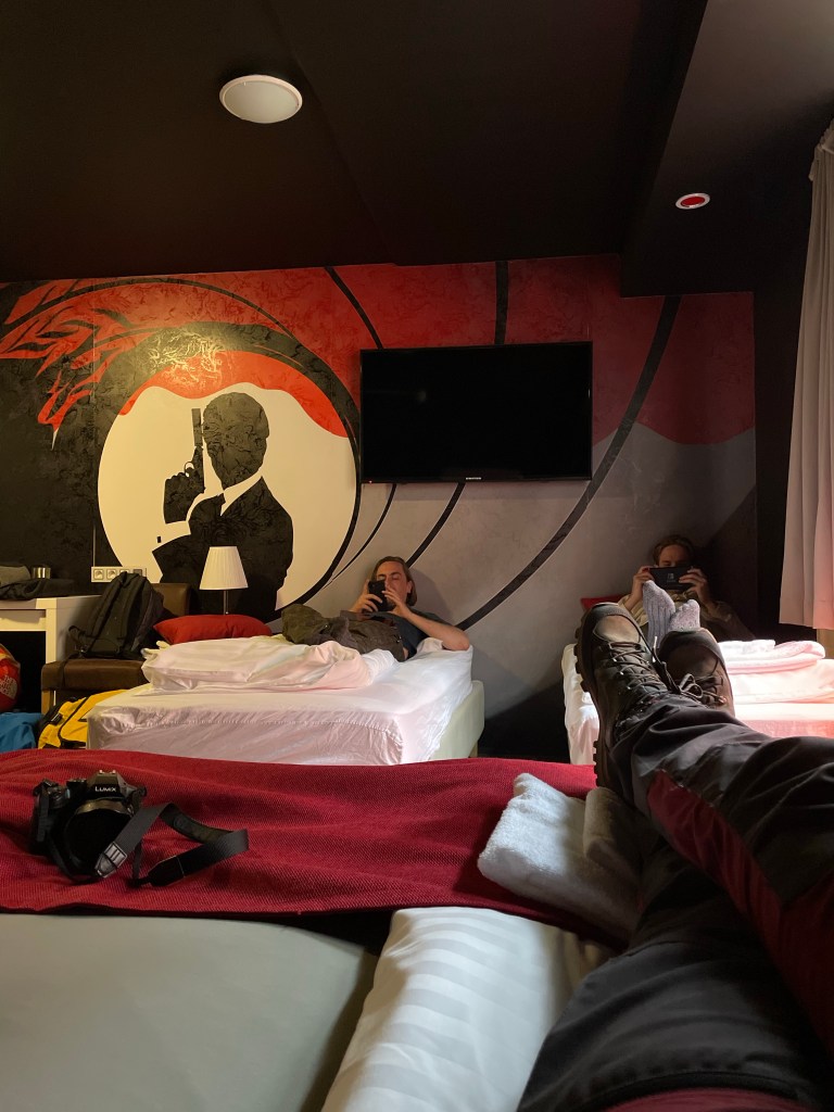 Wat een geweldige dag. Prachtig. En dan als slagroom op de taart ons hotel en onze hotelkamer, kamer 007. De hele lounge heeft oubollig rozerode pluche stoelen en honderd opgezette beesten. We maken grapjes over 007 voor we onze kamer binnenstappen en met open mond rondkijken. “Hideous” is een passende Engelse term. Het thema is stevig doorgetrokken. Roelof maakt de beste grap van de dag door te vragen om een reisstekker “want ze hebben Engelse stopcontacten om in het thema te blijven”. We trappen er alle drie in en Roelof hikt van het lachen om zijn eigen grap.