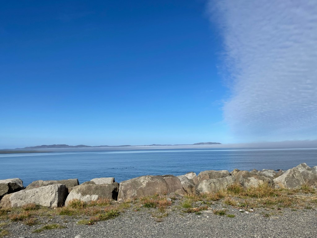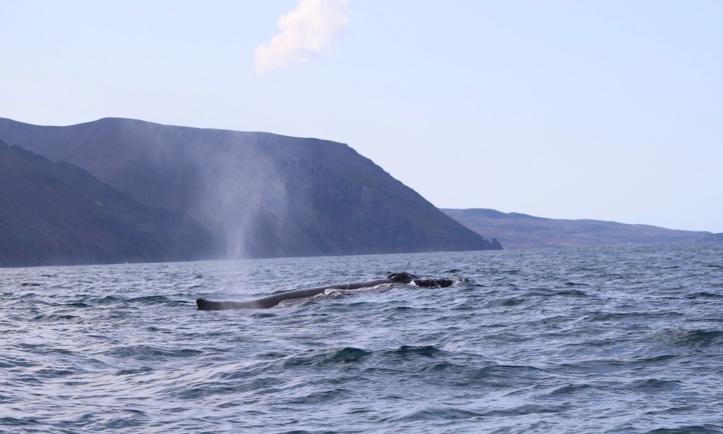 Wat gaaf: vijf walvissen, blauwe lucht en zon. Het is de 5e zonnige dag in een maand tijd zegt de gids. Wij hebben nog geen regen gehad. Thijmen lacht ons steeds uit over de laagjes en de windstopper en de regenjas.