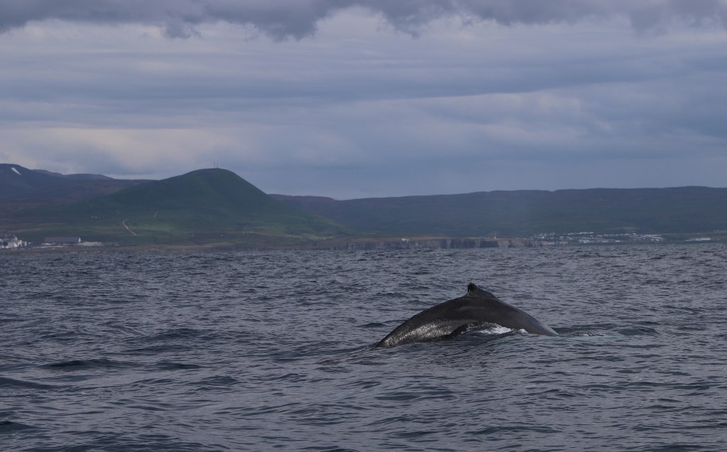 De eerste walvis die we zien duikt ongeveer gelijk onder, staart zichtbaar, maar ik was niet voorbereid. Thijmen ontdekt de volgende walvis maar die floeperd (de walvis, niet Thijm) smeerde hem gelijk de verte in. Die erna deed een duik zonder zijn staart uit het water te steken (dat is een beetje flauw). De vierde kwam een paar keer boven en dook toen naar de diepte, keurig met zijn staart uit het water, normaal komen ze dan na 5 min weer boven, maar deze niet. En de vijfde zagen we op de terugweg maar die gaf ons ook gelijk de staart om daarna in de diepte te verdwijnen.