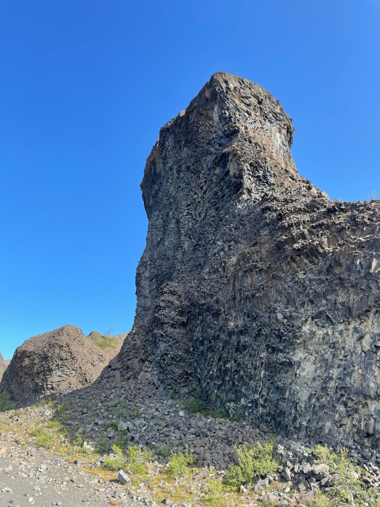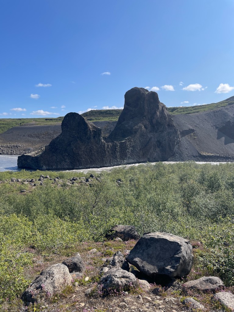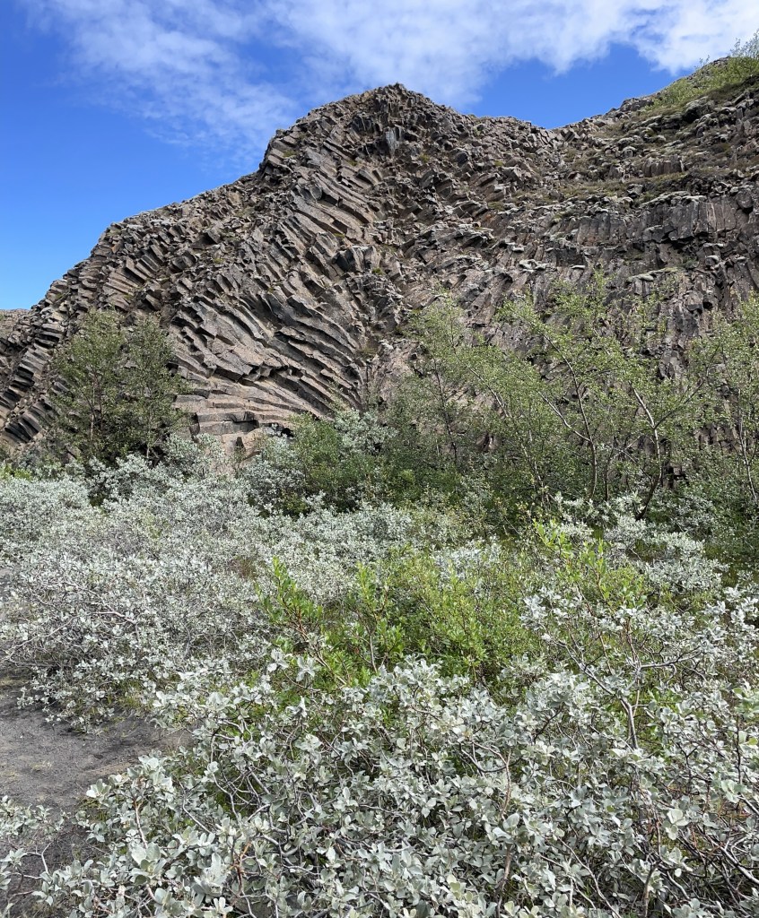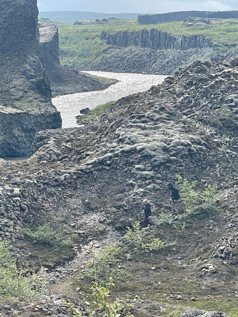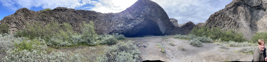 We gaan eerst naar Hljóðaklettar, het is zo raar, we rijden door groene vlakten, slaan links af en opeens is er een bizar basaltlandschap waar we in afdalen. We stoppen en beginnen met wandelen, ik had niet zoveel stijgen en afdalen verwacht anders had ik mijn brace aangedaan. Jelmer en Roelof gaan op een bepaald punt verder en net als Thijmen en ik hulptroepen op willen roepen komen ze terug “dit moeten jullie zien”. Dus samen gaan we toch samen verder. Briljant. Echt vreemd dat stenen zulke vormen aan kunnen nemen.