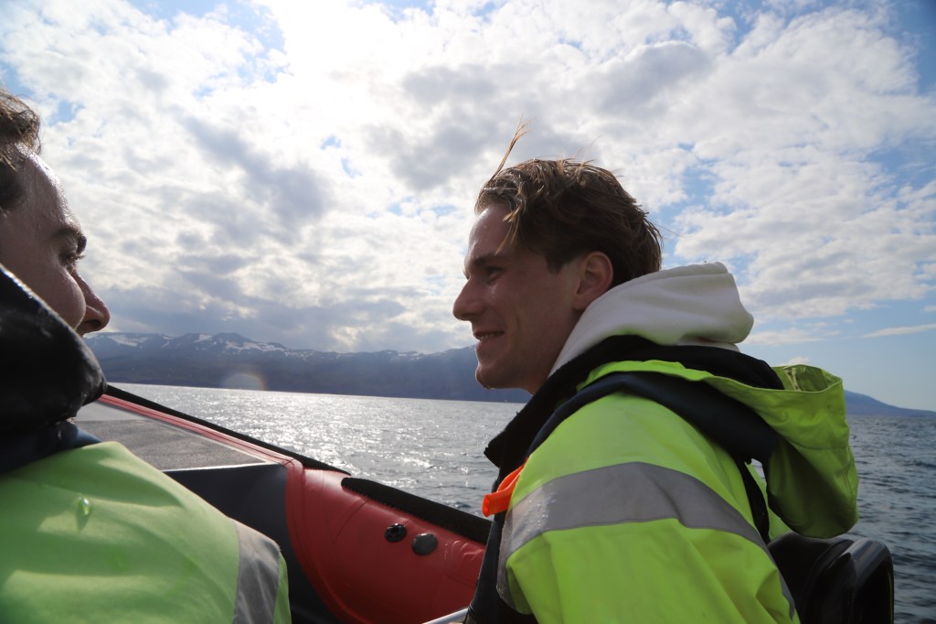 Daarna rijden we naar Hussavik voor een walvistocht. Hele gave boten. RIB. Rigid Inflatable Boat. Damn wat gaat het snel. De zon schijnt, de zee is redelijk kalm met lange gestage golven. Ik geniet van zee. Thijmen iets minder hij krijgt een golf oven zich heen.
