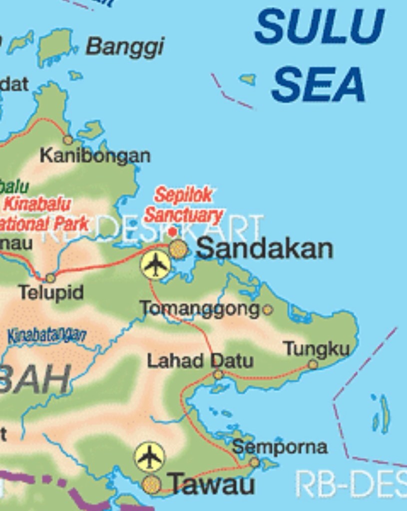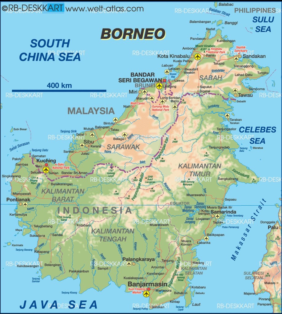 Toch, dit keer heb ik echt mijn best gedaan op meer rust. Bram stuurde me gisteren een berichtje van een man die 7 wereldwonderen in 6,5 dag bezocht. Wij gaan drie weken genieten van een piepklein deel van Borneo. Oppervlakte Borneo (een kleine 750.000 km2). Wij blijven in het gebied tussen Sandakan en Tawau, zo’n 300 km. Een pietseltje Borneo (op de kaart in het noordoosten).