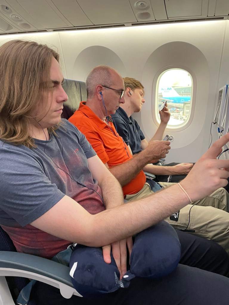 We zitten in het vliegtuig. Thijmens koorts is terug naar 37, al ziet hij er wel uit als een oude vaatdoek.