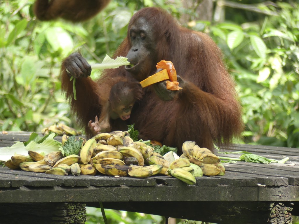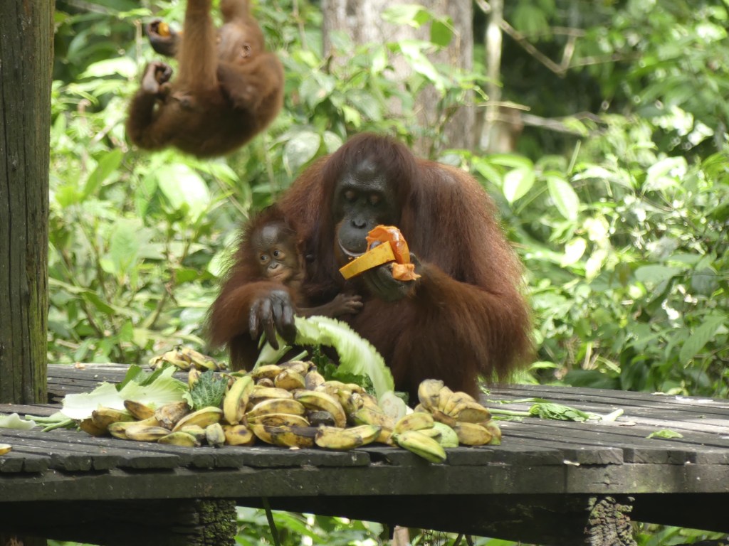 Van deze groep van zo’n 75 orang-oetans worden regelmatig de meest wilde teruggeplaatst in Tabin National Park. Ze voeren saai voer zodat ze voor lekker eten zelf op pad gaan. We hadden mazzel er kwamen er 7 eten. En later, op een andere plek, een moeder met baby en kleuter. Het goede nieuws is dat er dan 65 hun eigen kostje in het enorme gebied hebben opgezocht.