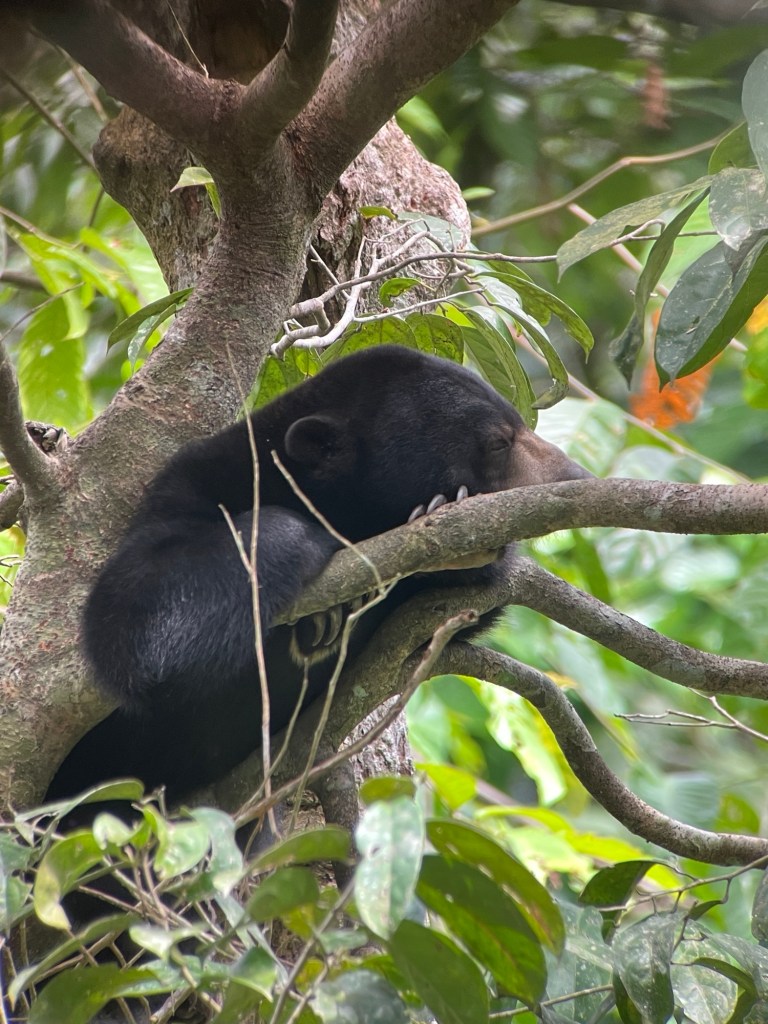 Als laatste naar het Sunbear centre, deze beesten raken toch zwaar getraumatiseerd door de mens. Na wat jaren in een kooi snappen ze de jungle niet meer. De meesten redden een terugplaatsing niet. Maar ze hebben fantastische plekken. We zagen er één boven in de boom een uiltje knappen.
