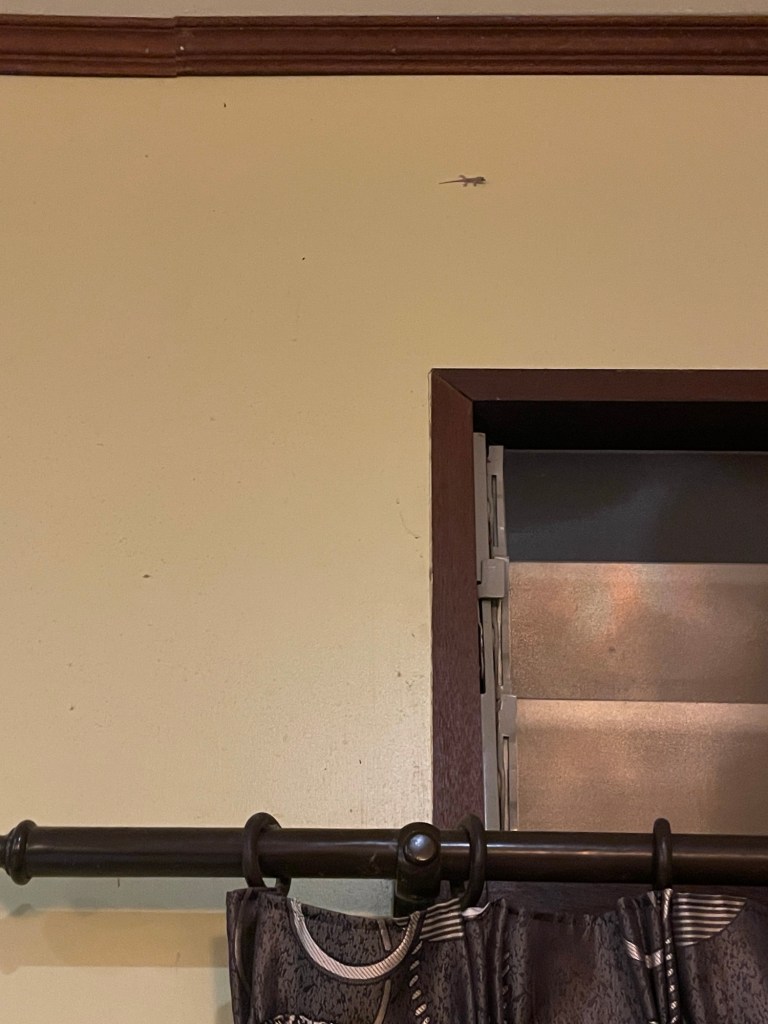 Gisteravond hadden we twee mini gekko’s aan de muur van de slaapkamer. Heel schattig. Ik dacht eerst tevreden dan komt het wel goed als er een mug langskomt. Maar helaas kwam er gelijk een tweede gedachte: waar komen die twee vandaan? En kunnen daar geen muggen door?