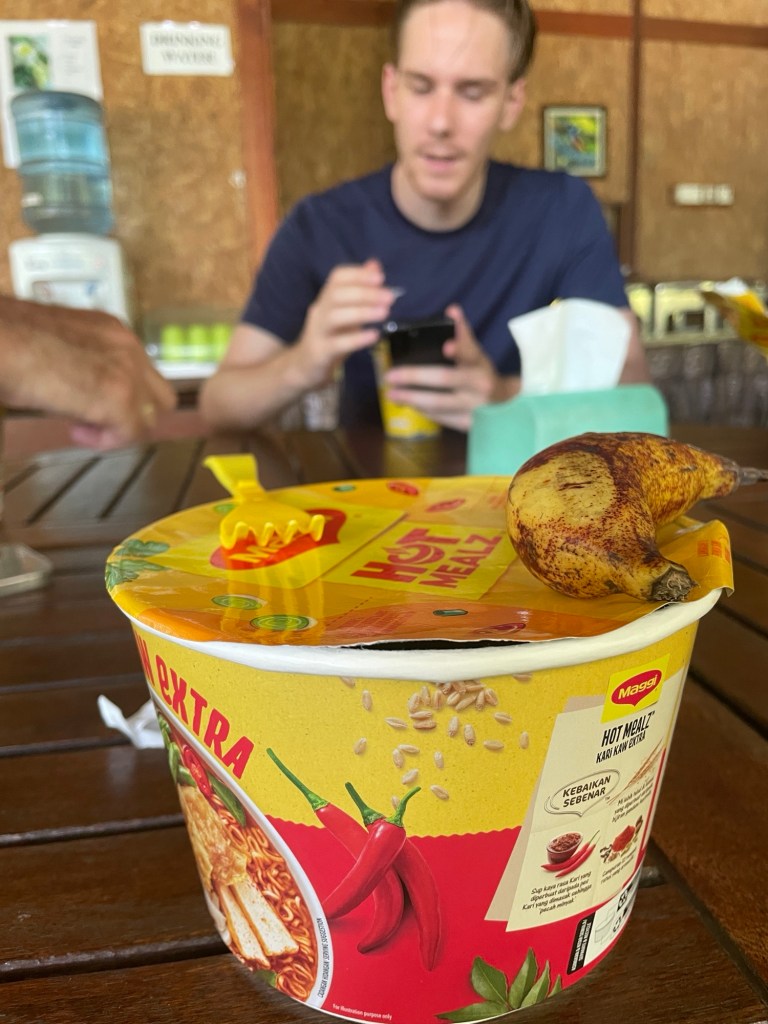 We nemen voor vertrek nog een bak noedels. Er is niet veel keuze en we letten niet goed op. We hadden kunnen bedenken dat 3 pepers niet staan voor mild mondgevoel. Nu, een uur later, tintelen mijn lippen nog steeds. Roelof dronk de bouillon, tranen over zijn wangen van genot.