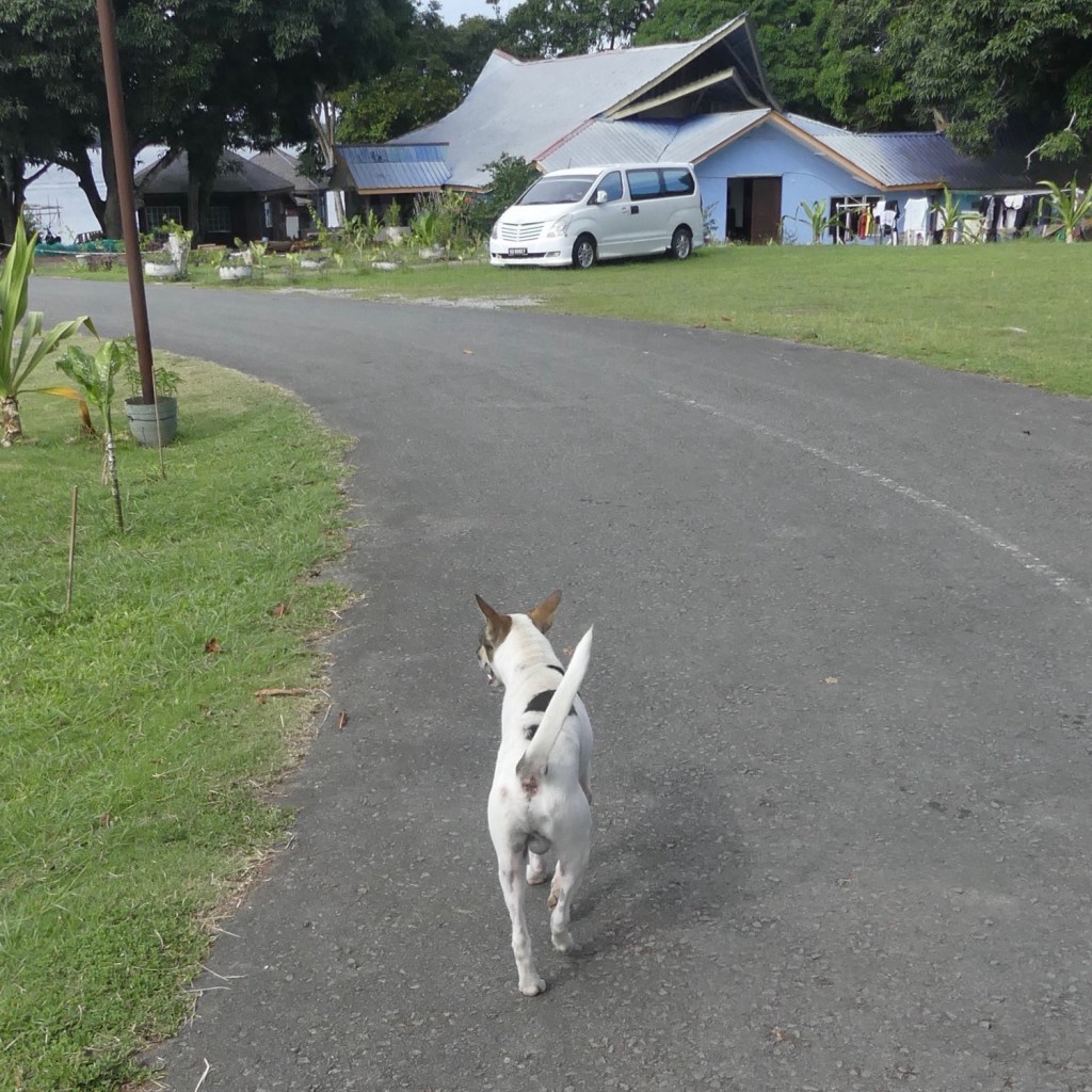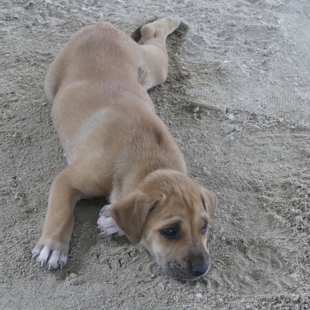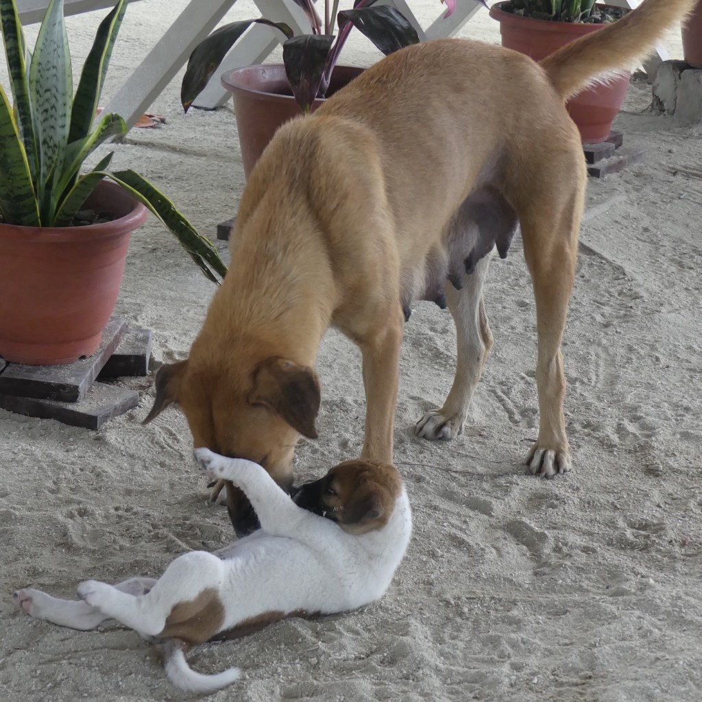 Best een lange rit maar nu zitten we op het terras met uitzicht op zee. Helaas zijn de keuken en dining hall afgebrand en daarom eten we op een terras buiten. Er scharrelen honden rond. Een moeder en 4 pups. Het zijn mooie honden, niet heel groot, slank en mooie koppen. Het is grappig hoe ze hen leert niet steeds te sabbelen als ze loopt. Even een beet om hun snuitjes. Consequent gedaan. Er is een heel mooi vrouwtje, een puber, maar die schooiert enorm. Op een gegeven moment jat ze eten van tafel. Er zit een duikinstructeur naast die haar corrigeert en bad dog zegt. Bad, bad dog! Ik zeg dat ze er wel mee weg komt, ze is te mooi, mooie vrouwtjes kunnen boevenstreken doen zonder in de problemen te komen. Hij schatert en is het met me eens. Dat is leuk aan dit land, mensen zijn vrolijk en goedlachs.