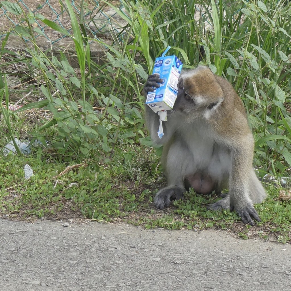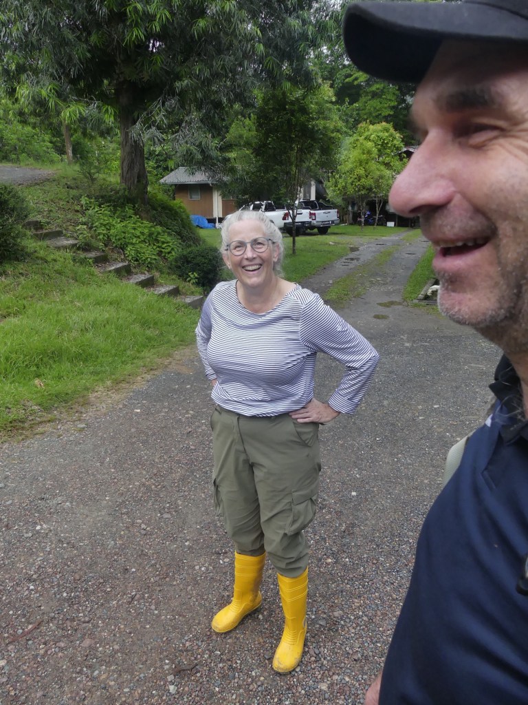 We doen een laatste wandeling. Ik leen laarzen omdat mijn schoenen kledder zijn. Jelmer zegt lief dat ik er met vrolijke gele laarzen minder als ma Flodder uitzie. We zien alleen hoog in de bomen de gibbons racen en even later verjaagd worden door de makaken (met lange staart).