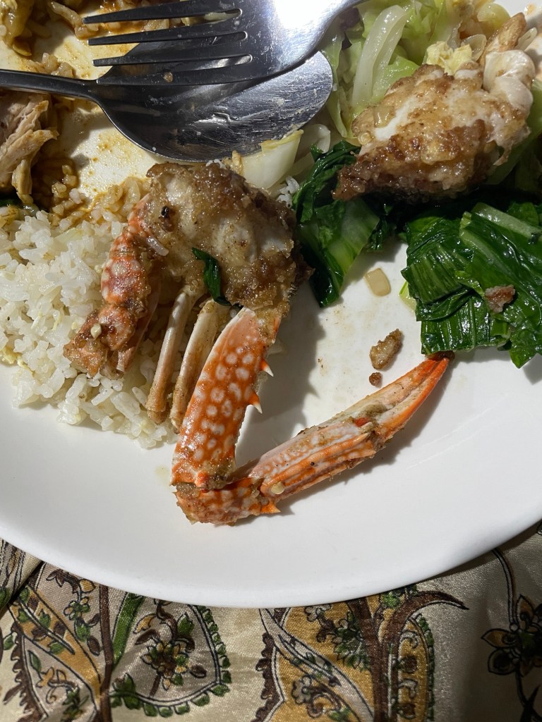 Avondeten. Er is krab, hoe eet je dat? Wat ik eruit krijg is verrukkelijk. Maar ik zit er onhandig mee te peuren. Doet me denken aan hoe ik op mijn 19e met mijn neef uit eten ging en hij schol bestelde. Ik wilde het ook graag proberen, maar had geen idee. Dus hij deed het me voor en het was heerlijk. Ik kijk onopvallend naar mijn buren: Twee Chinese vrouwen die een stuk met stokjes pakken en daar een stuk afbijten en de harde buitenkant in brokjes uitspugen. Oké zo wil ik het dus niet leren. Jelmer kan het een beetje maar het lukt niet altijd. Wayne in Amerika had het hem geleerd. Waar is Wayne als je hem nodig hebt?