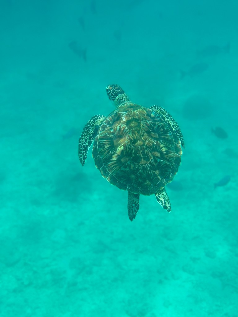 De eerste plek is mooi. Weinig plastic in het water. Het koraal is treurig, maar we zien wel drie zeeschildpadden.