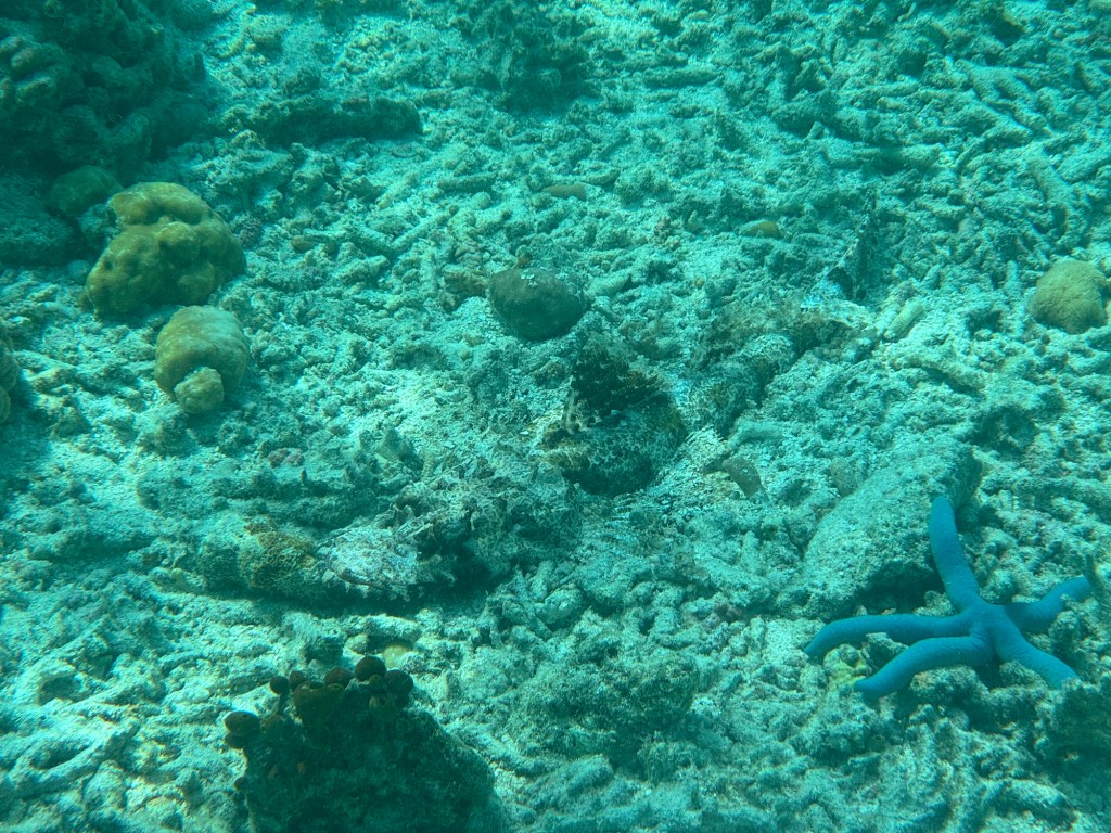 De derde plek zit er tussen in, we zien een hele grote zeeschildpad die majestueus wegzwemt. Maar Thijmen spot ook de waanzinnig goed gecamoufleerde krokodilvis