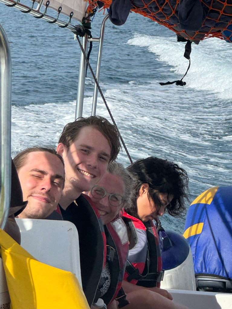 Onze boot ligt niet lekker in het water. We moeten allemaal voorin zitten als hij start zodat hij lekker loopt. Maar als het dan gaat kunnen we één voor één weer op de goede plek gaan zitten. Roelof heeft zich bij de divemasters gevoegd en zit voorin te genieten.