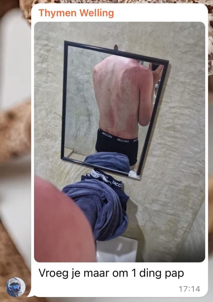 Terug blijkt dat, ondanks meermalen factor 50 smeren, mijn gezicht wel wat rood is. En de achterkant van mijn benen is gevoelig. Die heb ik misschien een pietsie te nonchalant gesmeerd. Terug in het hotel stuurt Thijmen een appje in de familie app. Ik had hem kunnen vertellen dat Roelof niet de nauwkeurigste smeerder is. En: We kunnen wel stellen dat factor 50 wat doet.